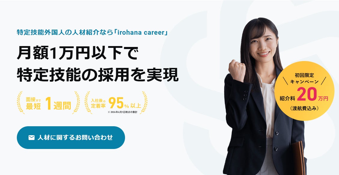 紹介料20万円(渡航費込み)+ビザ申請費用5万円で特定技能外国人を採用できる、初回限定キャンペーンを実施