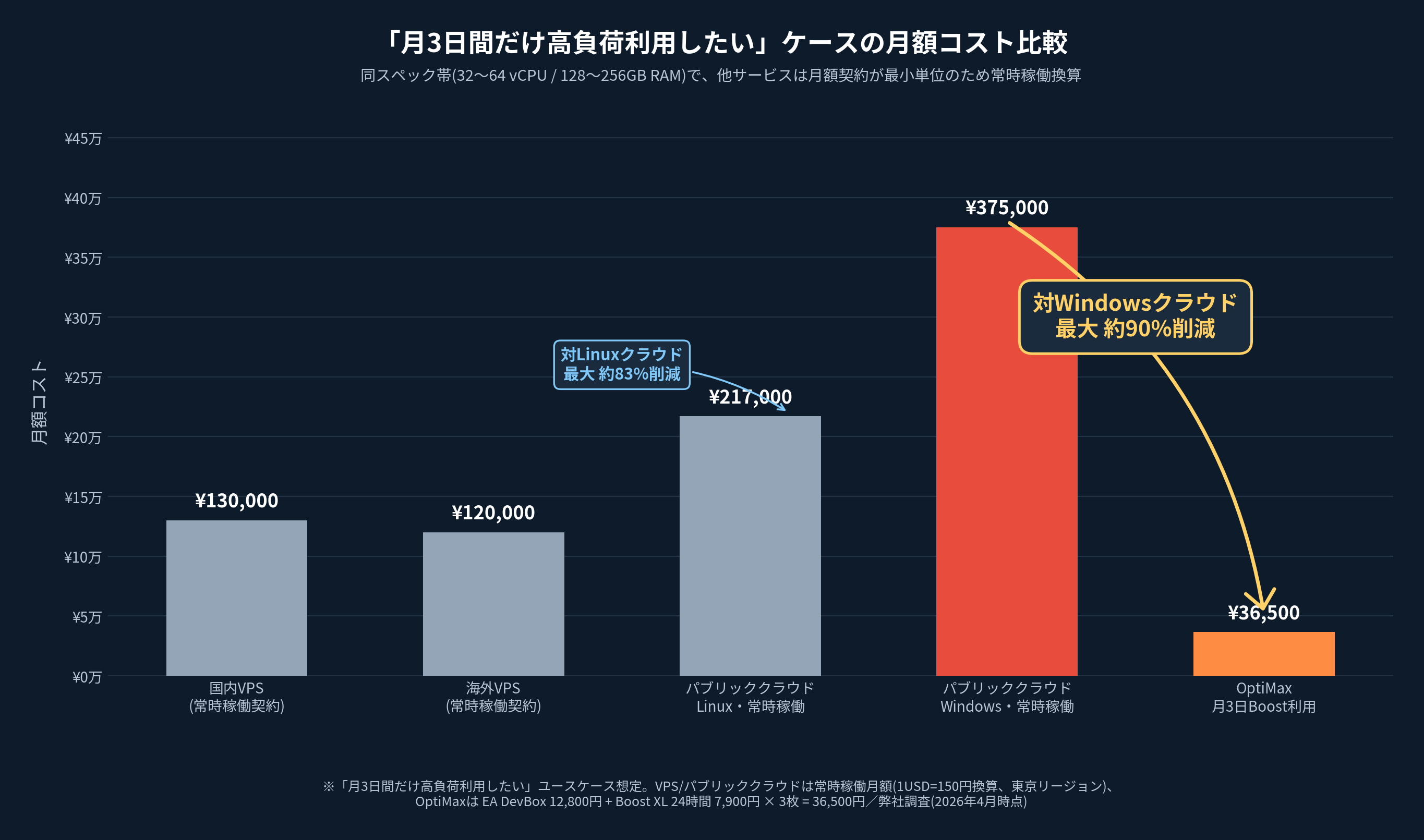 パブリッククラウド(Windows、64vCPU/256GB帯)常時稼働時の月額 約375,000円(AWS m5.16xlarge Tokyo Windows相当、1USD=150円換算)を基準とした場合、OptiMax月3日利用時(約36,500円)との差は 1 − 36,500 / 375,000 ≒ 90.3%。Linux同帯(約217,000円)基準の場合は 約83.2% となります。比較条件が変わればコスト削減率も変動します。
