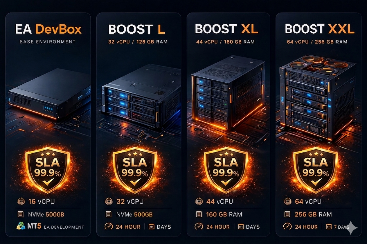 月額固定の「EA DevBox」(16vCPU / 64GB RAM / NVMe 500GB、12,800円/月)で開発環境・EA・履歴データ・設定を継続保持しつつ、重い最適化が必要な時だけ「Optimizer Boost」を 24時間・7日・30日単位のチケット制で追加できるサービスです。