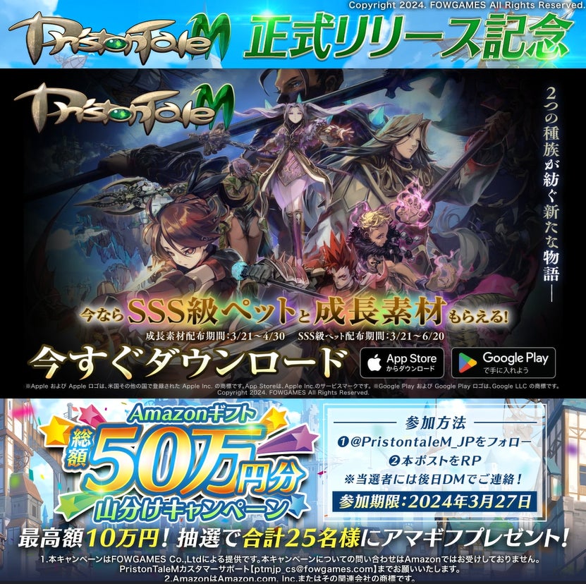 『プリストンテールM』公式Xアカウントにおいても、正式リリースを記念しまして総額50万円分の「Amazonギフトカード」が合計25名様に当たる山分けキャンペーンを実施中です。最高当選額は10万円分という豪華キャンペーンとなっておりますので、ぜひお見逃しなくご応募ください。