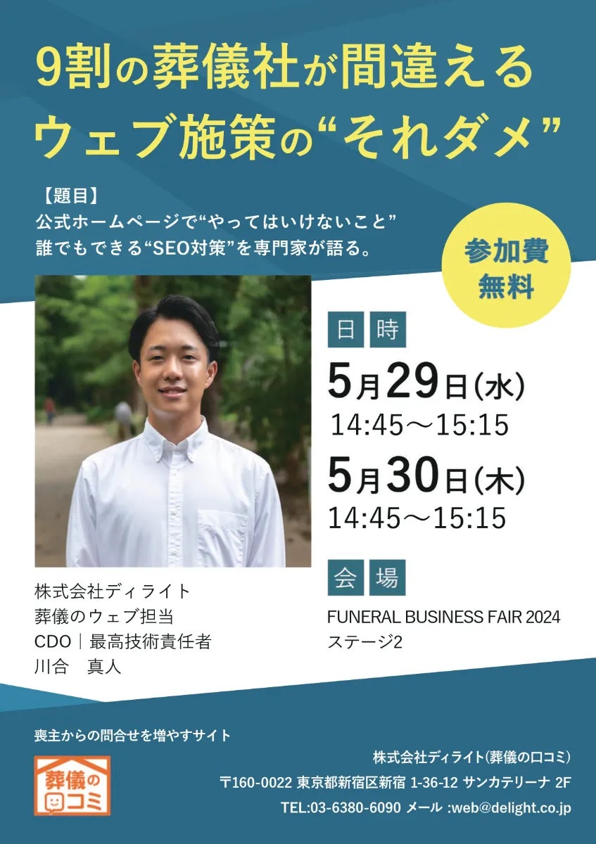 2024年5月29日~30日にかけてパシフィコ横浜にて行われる『フューネラルビジネスフェア2024』に株式会社ディライトの「葬儀の口コミ」と「葬儀のウェブ担当」が出展いたします。また「葬儀」「ウェブ」「AI」に関する講演も実施いたします。