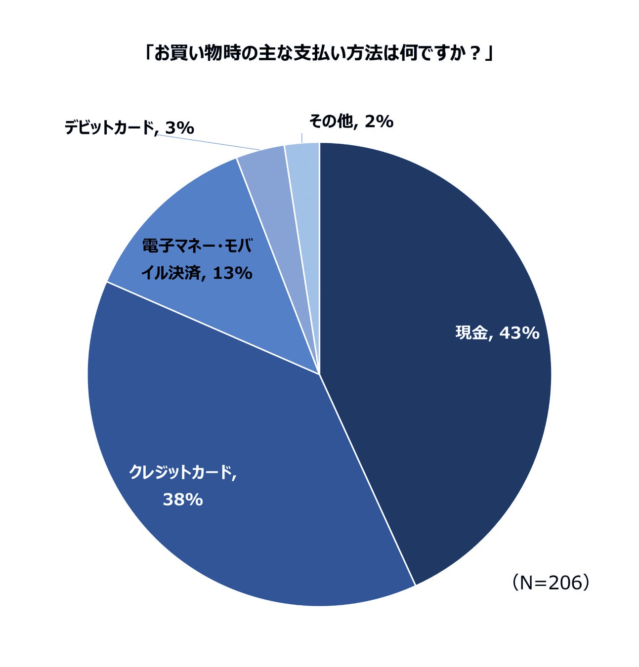 いつもの買い物で使う主な支払い方法は、現金が43%、クレジットカードが38%、電子マネー・モバイル決済が13%、デビットカード3%となりました。