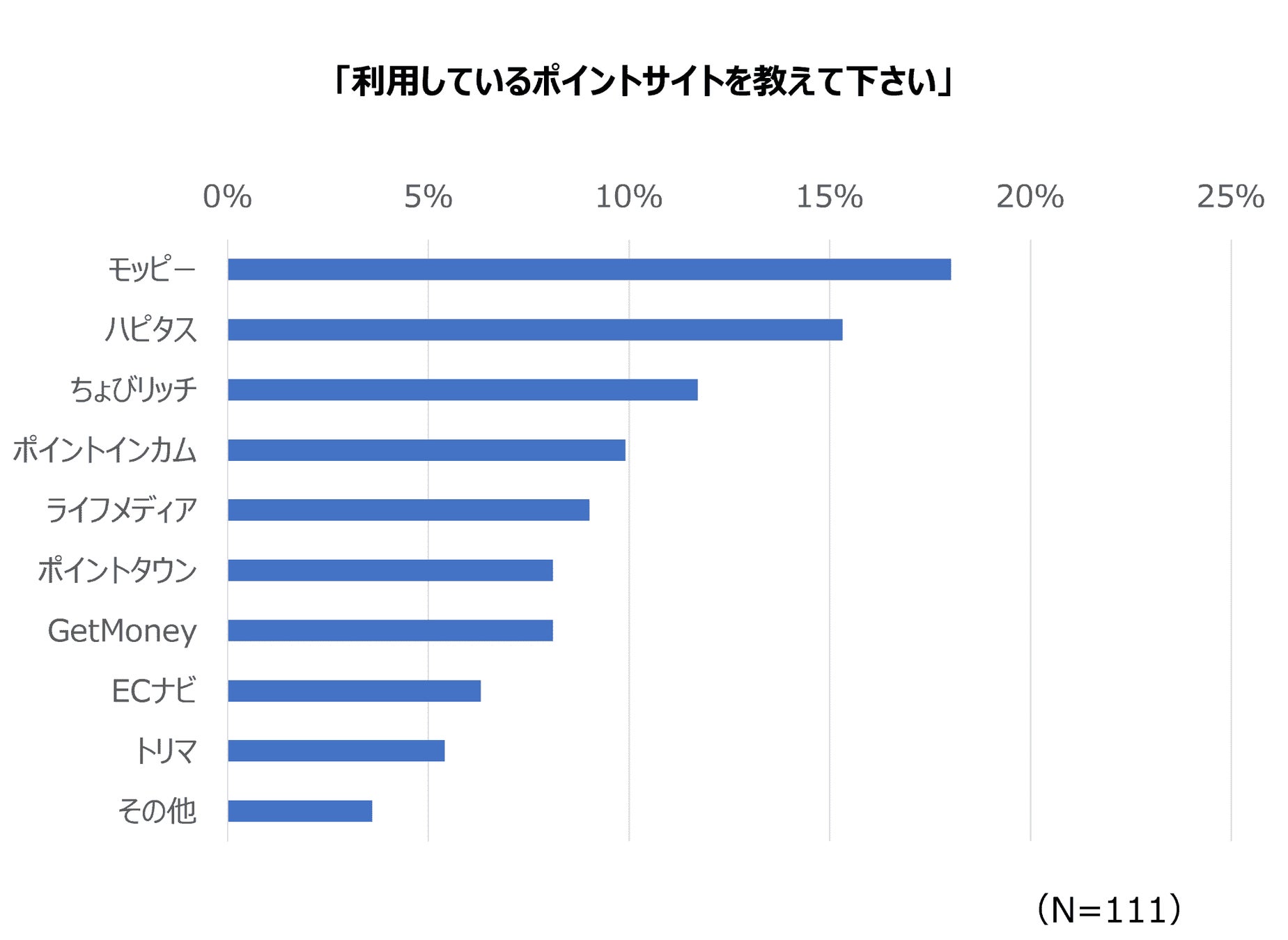 よく使うポイントサイトは、モッピー(18%)、ハピタス(15%)、ちょびリッチ(12%)、ポイントインカム(10%)、ライフメディア(9%)、ポイントタウン(8%)、GetMoney(8%)、ECナビ(6%)、トリマ(5%)などが挙げられました。
