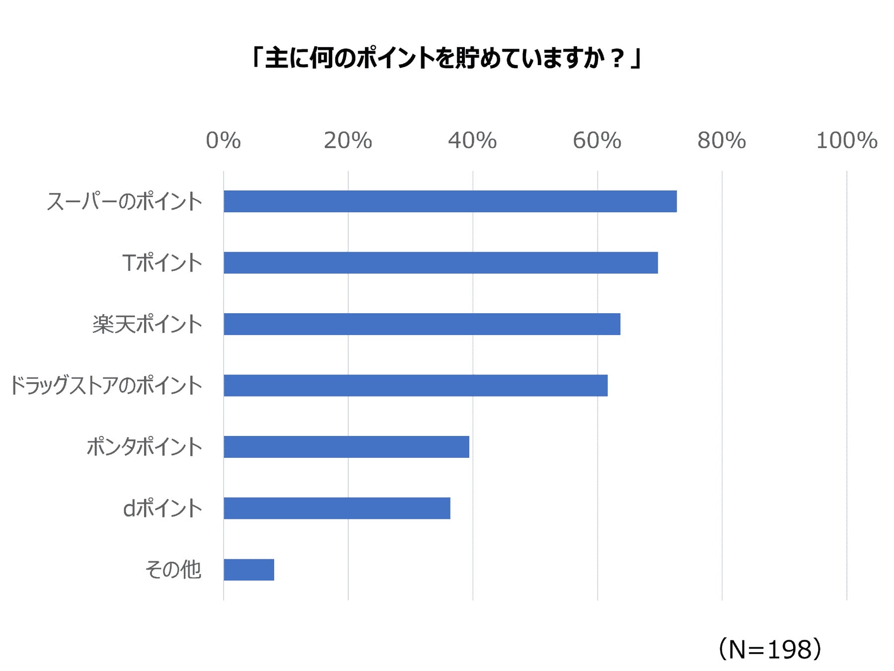 「スーパーのポイント」が73%、「Tポイント」が69%、「楽天ポイント」が64%、「ドラッグストア」が62%、「ポンタポイント」が39%、「dポイント」が36%となりました。