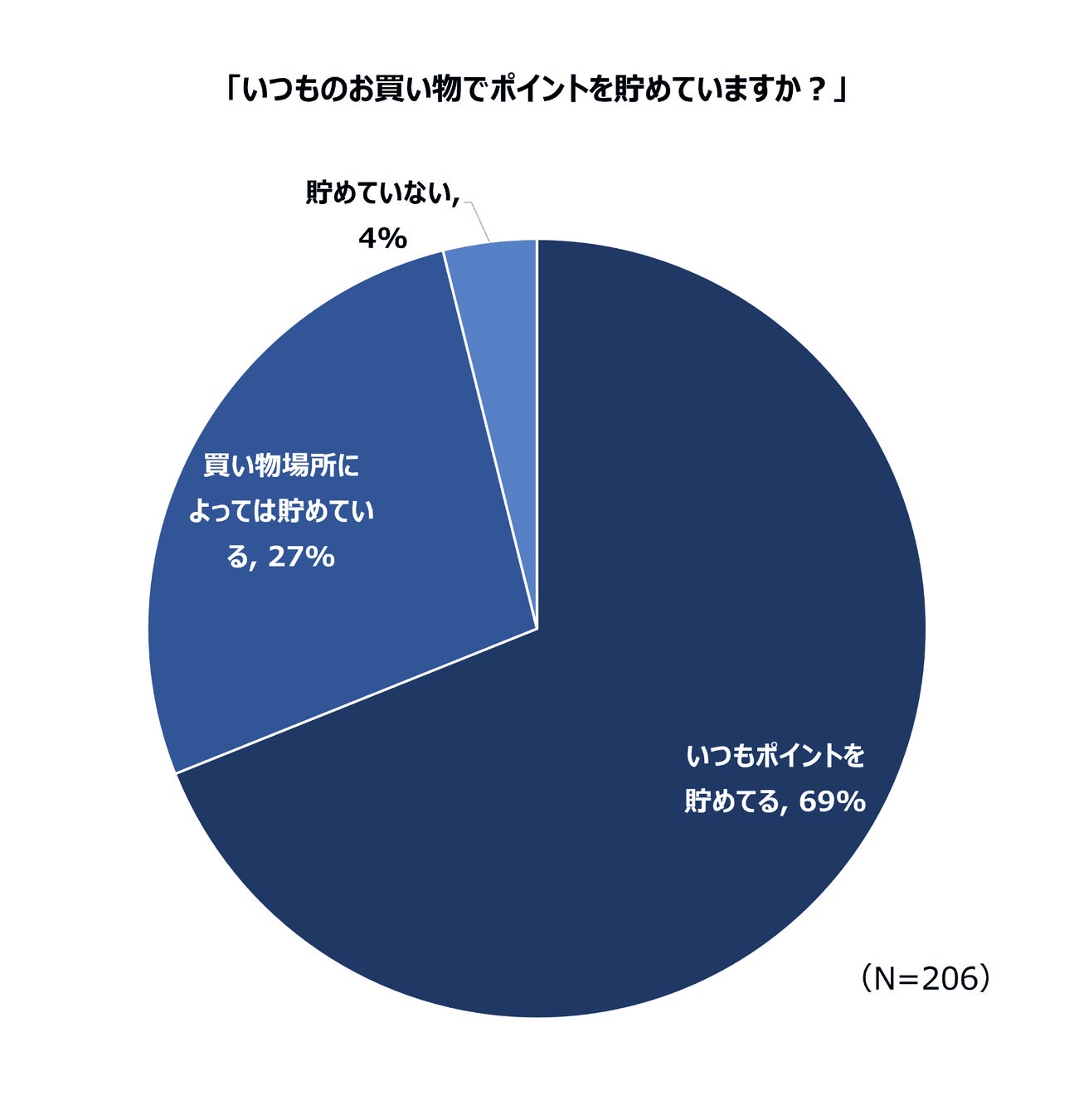 「いつもポイントを貯めてる」は全体の69%、「買い物場所によっては貯めている」は27%、「貯めていない」人は4%となりました。買い物場所によるものの、ほぼ全員がポイントを貯めていることがわかりました。