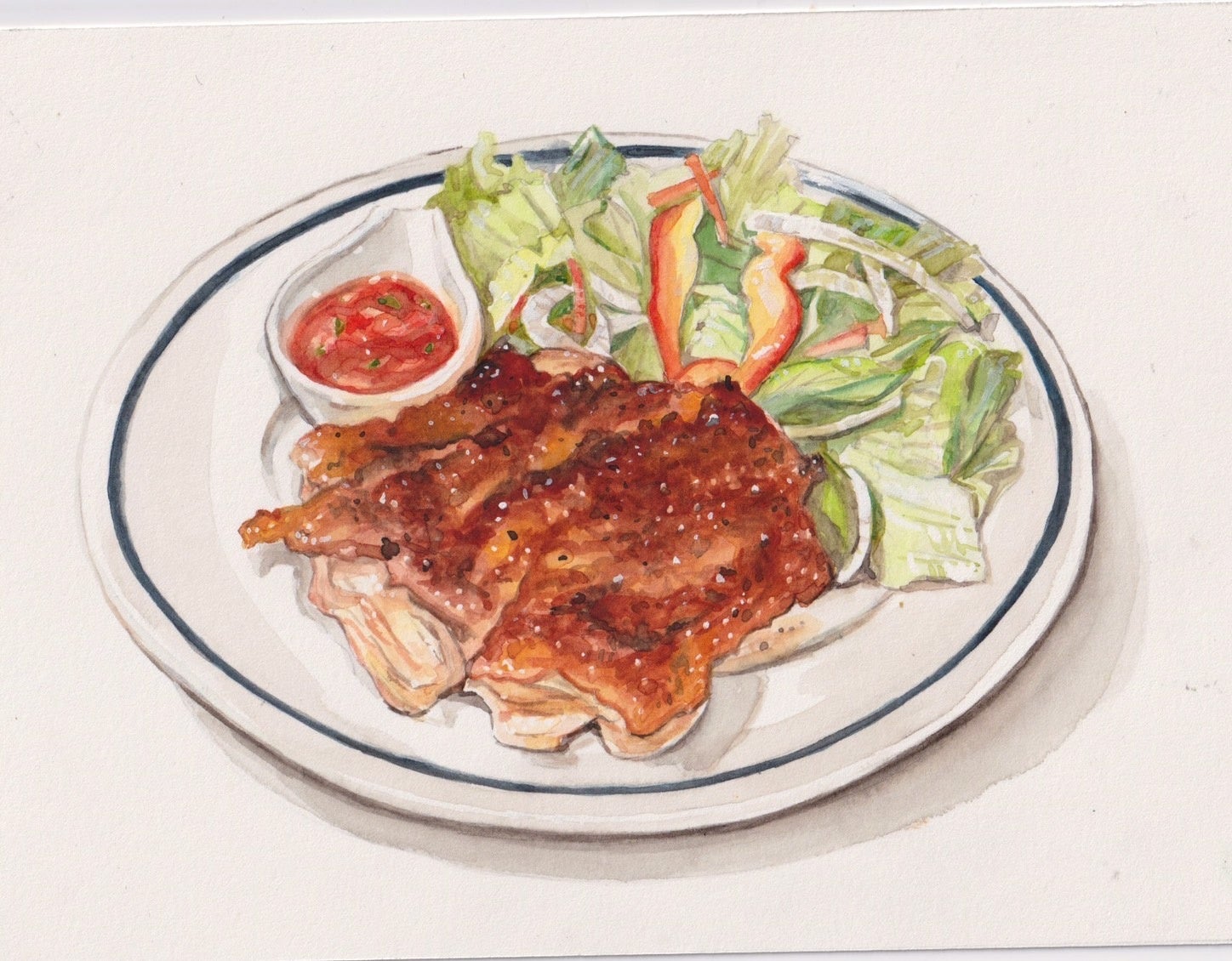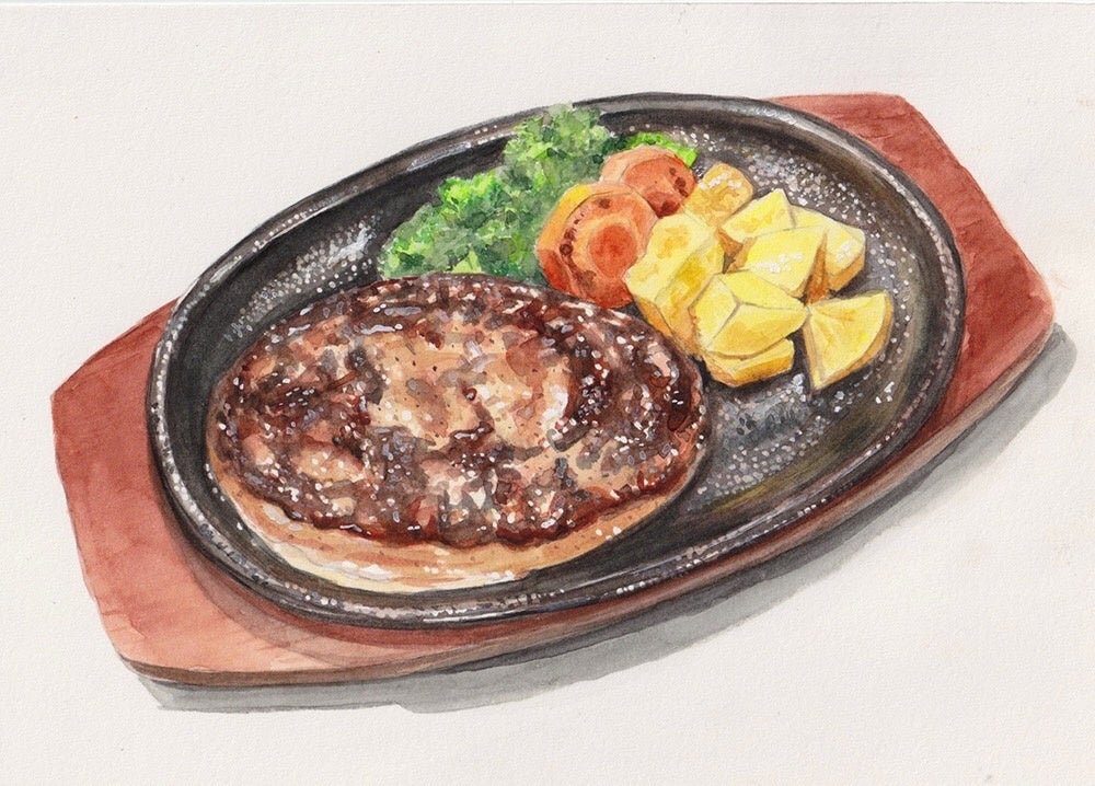 おいしさの秘訣は、鉄板でじっくりと焼き上げること。肉汁が内部に閉じ込められ、ハンバーグ全体が豊かな食感に仕上がっています。付け合わせのお野菜とともに、熱いうちに召し上がっていただきたい一品です。