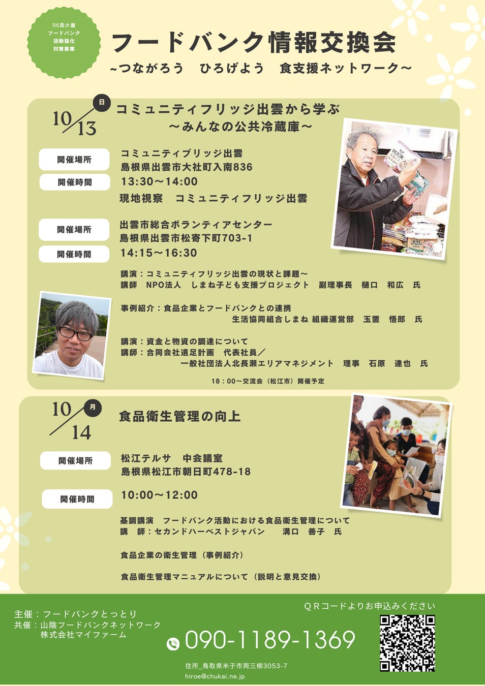 フードバンクとっとりさん主催の「情報交換会」で、「コミュニティフリッジ出雲の現状と課題」と題してご報告いたします。また、当法人の拠点もご視察いただけます。ふるってご参加ください!