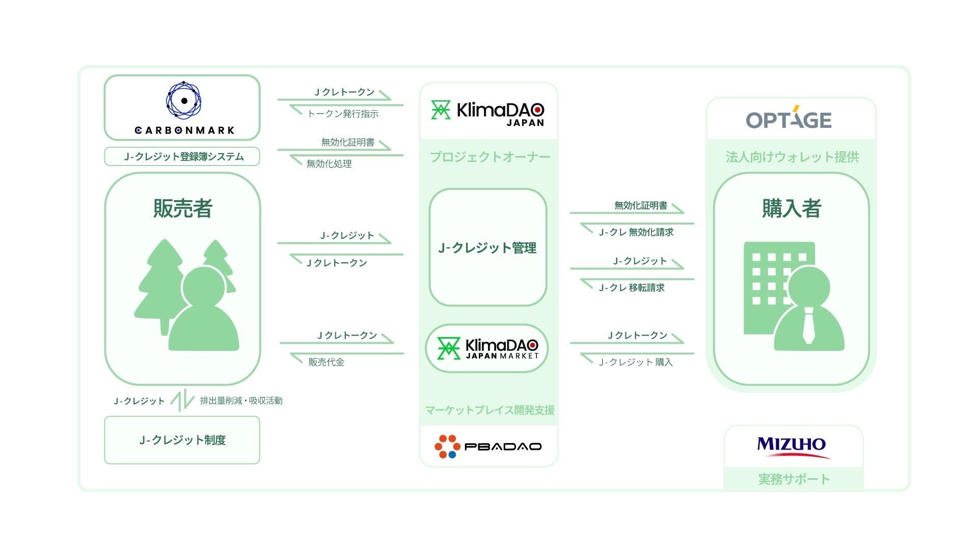 KlimaDAO JAPAN株式会社(代表取締役:濱田 翔平、本社:東京都中央区)は、ブロックチェーン基盤のカーボンクレジットマーケットプレイス「KlimaDAO JAPAN MARKET」のベータ実証を開始いたします。今回の実証実験(以下、本実証)は、株式会社オプテージ(代表取締役社長:名部 正彦、本社:大阪市中央区)が企業向けウォレットの提供を担い、株式会社みずほフィナンシャルグループ(執行役社長:木原 正裕、本社:東京都千代田区)がプロジェクトの実務サポートを行い、株式会社PBADAO(代表取締役:芳賀 真/堀井 紳吾、本社:東京都渋谷区)がプロジェクト管理・開発支援を行います。
