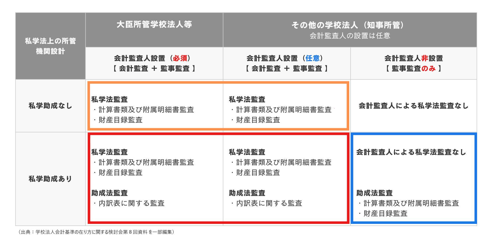 私学法に基づく監査は多様なステークホルダーの重要性の増加に鑑み、ステークホルダーをはじめ広く社会一般に情報を開示することで透明性を高め、適正な管理運営を期する枠組みの一環として行われるものであり、この点、補助金交付を目的とする私立学校振興助成法に基づく監査とはその目的が異なります。