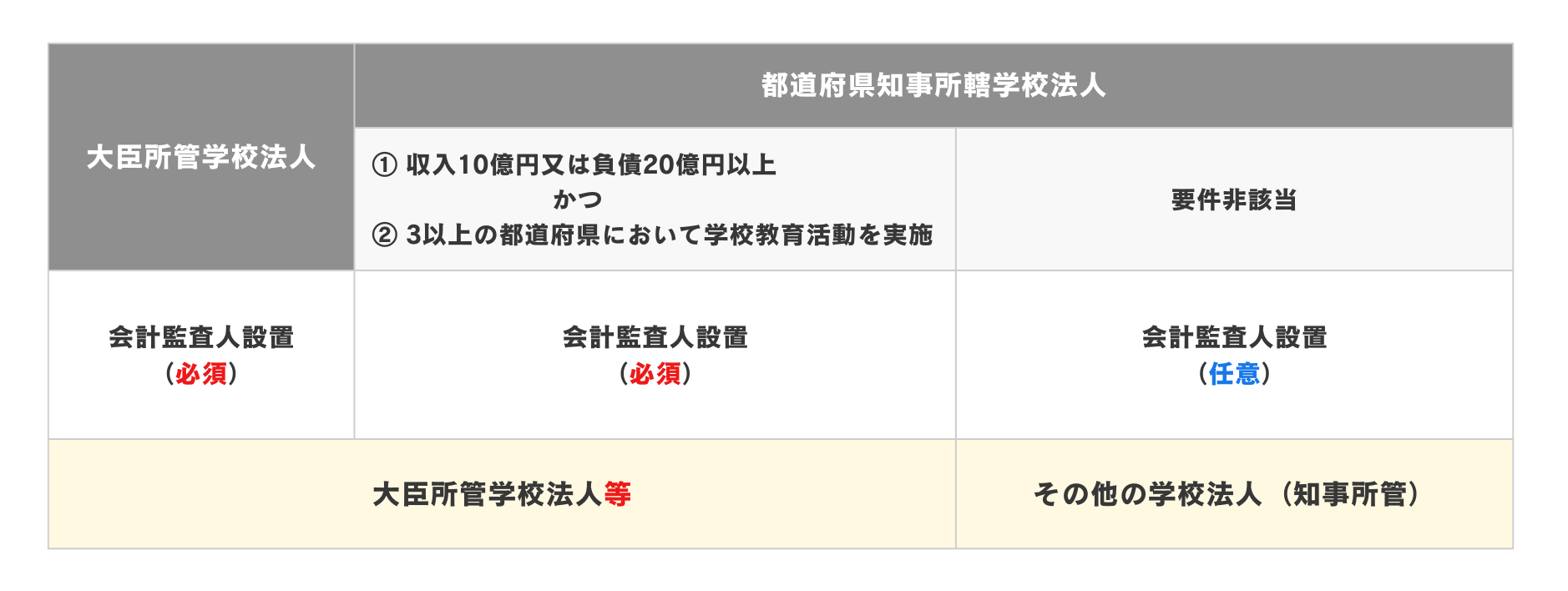 上図の通り、会計監査人の設置が義務付けられる学校法人は一定の要件を満たす都道府県知事所管学校法人も対象となるため、都道府県知事所管学校法人に置かれましては当該条件を満たす可能性がある場合、対応の検討が必要となります。
