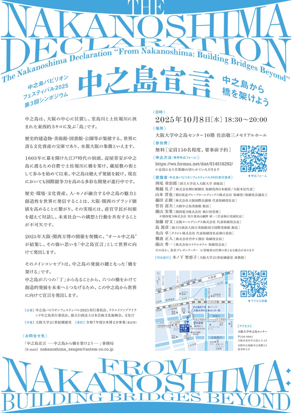 【10月8日開催】中之島パビリオンフェスティバル2025 第3回シンポジウム「中之島宣言 ―中之島から橋を架けよう―」