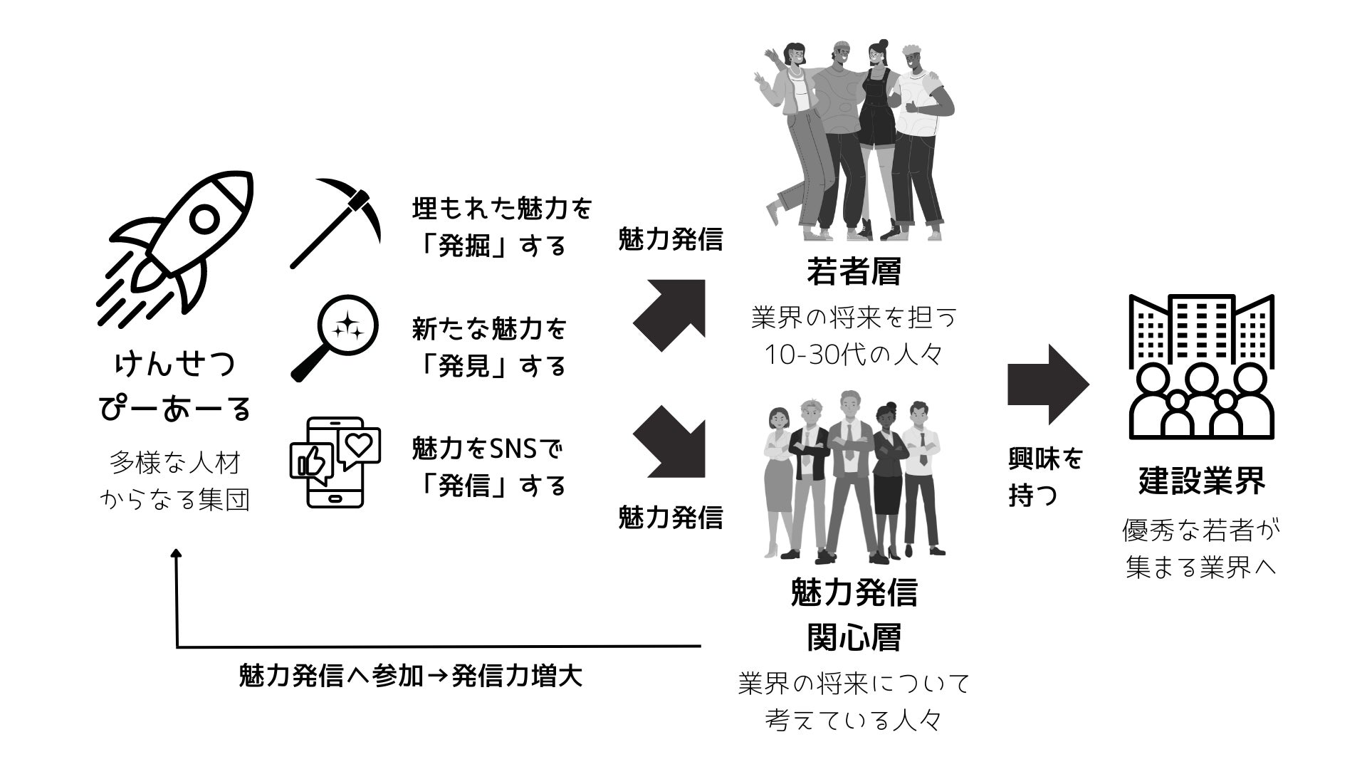 建設業界は人々の生活や経済発展の基盤となる建物やインフラを生み出す重要な役割を担っています。しかしながら、少子高齢化や魅力低下による深刻な人材不足を抱えており、人々の生活や経済発展に大きな影響を及ぼす可能性があります。そこで、「けんせつぴーあーる」では、建設および建設が生み出すものの魅力発信に関心のある多様なメンバーを集め、魅力発信をすることで「建設業界を優秀な若者が集まる魅力的な業界にする」べく取り組んでいます。