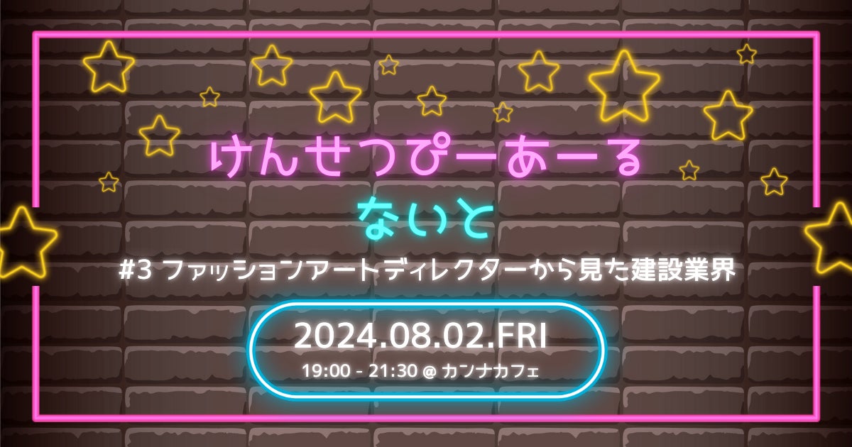 この度、「ファッション×建設」をテーマにした「けんせつぴーあーるないと #3 〜 ファッションアートディレクターから見た建設業界 〜」を、2024年8月2日(金)@カンナカフェにて開催します。ご関心がある方は、お申し込みウェブサイトよりチケットをご購入の上、ご参加ください。
