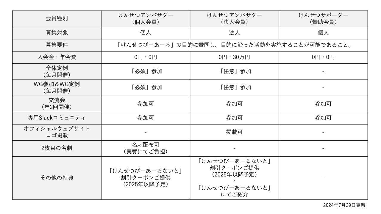 「けんせつぴーあーる」では、我々のミッションにご賛同いただける個人・法人会員の募集を開始します。会員種別は「けんせつアンバサダー(個人会員)」、「けんせつアンバサダー(法人会員)」、「けんせつサポーター(賛助会員)」の3種類です。