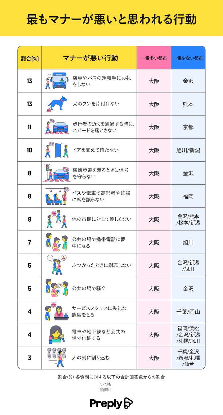 講師とマンツーマンで学習ができるオンライン語学学習プラットフォームを提供するPreply(本社:アメリカ、CEO:Kirill Bigai)は『マナーが悪い都市』に関する調査結果を発表しました。