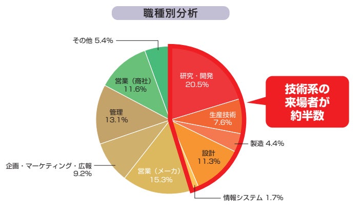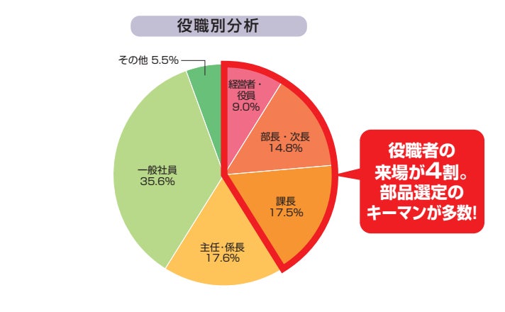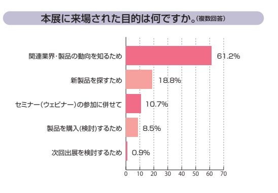結果報告書では、来場者数だけでなく、来場した方の業種や職種、役職別の分析に加え、展示会に来場した目的についてのアンケートもご覧いただけます。本記事では、結果報告書の内容を一部ご紹介しております。