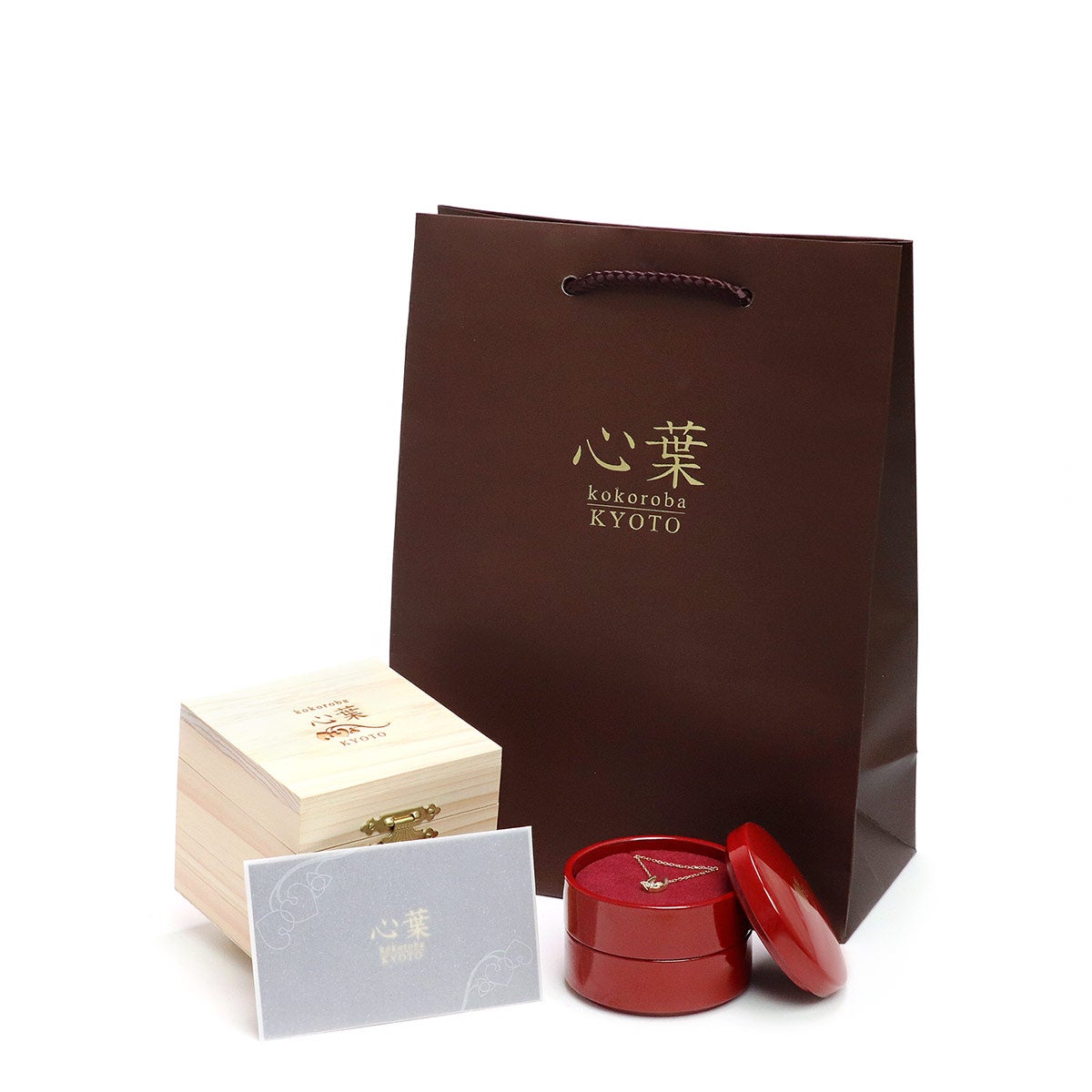 心葉ジュエリーは、ブランド語源の贈り物に添える「心づかい」を大切に、ジュエリーを彩るお品すべてに拘りました。ネックレスは本漆塗り、漆器のジュエリーケースに入れ、京都の職人さん手作り、天然無垢の檜の外箱にお入れしお届けいたします。自然がもたらす本漆と天然無垢の木目は、時を重ねるごとに色味が増し、世界に一つだけの深みある表情をお楽しみいただけます。