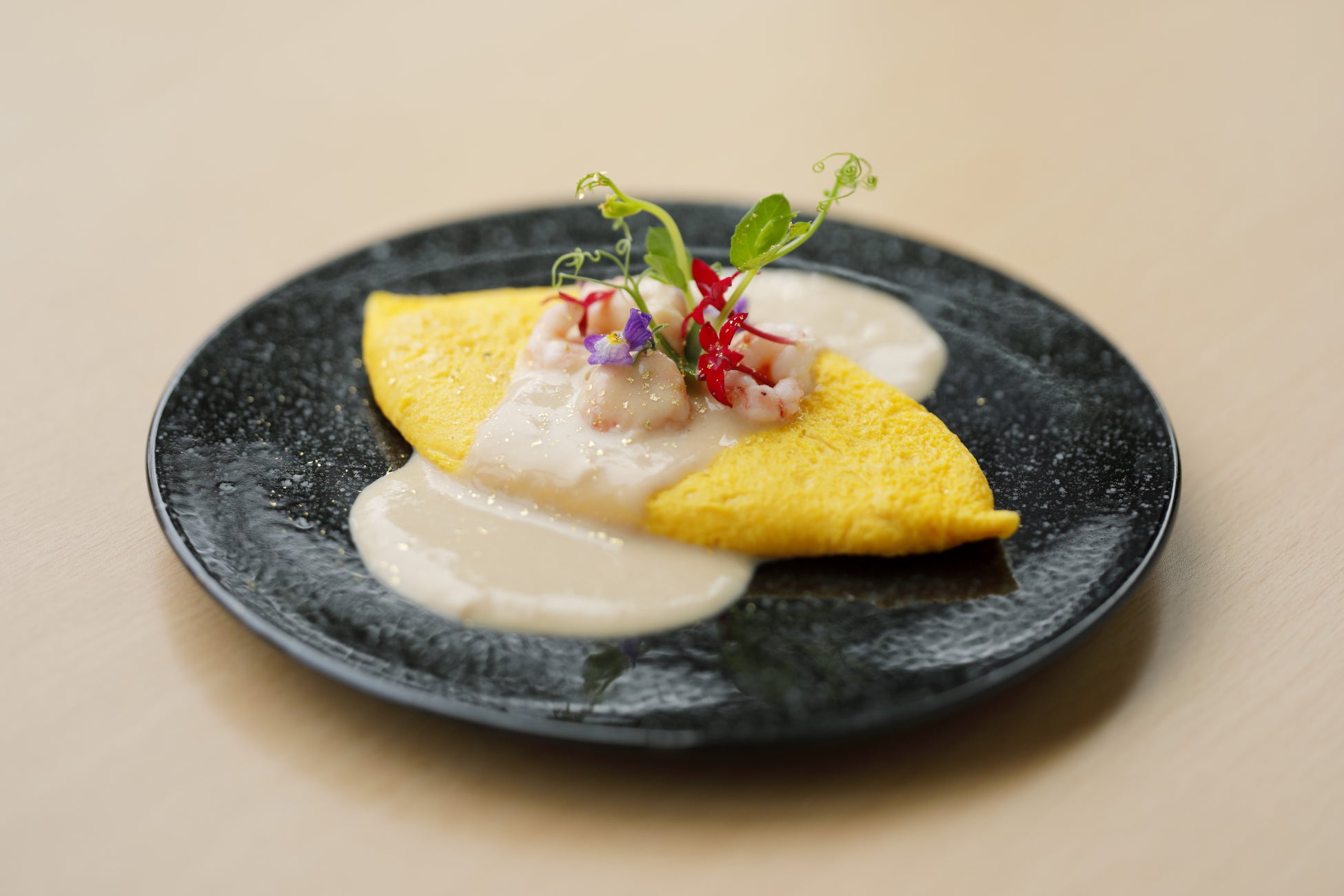 コロナ禍に始めた毎朝限定30食の「朝の彩りオムレツ」が人気。甘エビのクリームソースや金箔など味や見た目も愉しめる金沢らしさを満喫できるオムレツです。