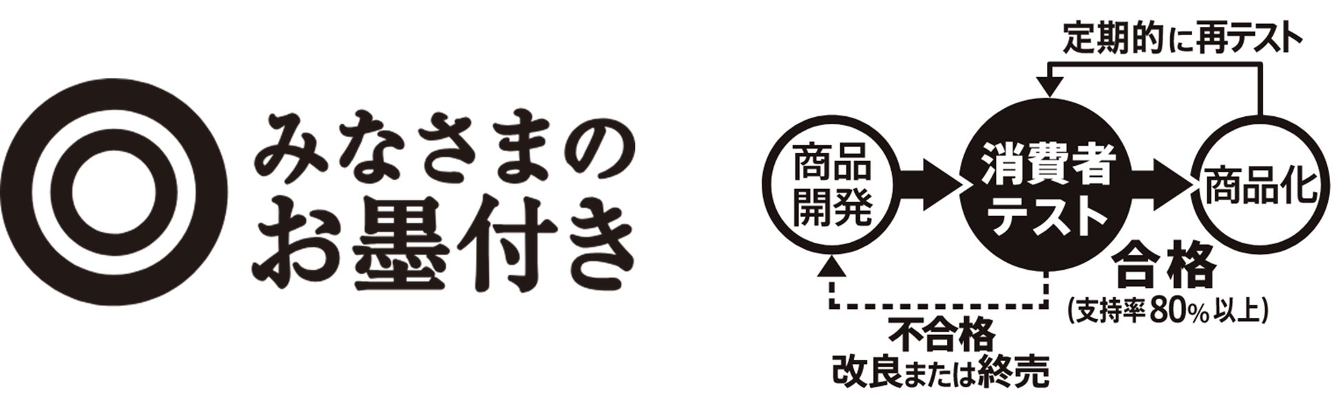 「みなさまのお墨付き」は、第三者機関が実施する厳正な消費者テストで80%以上の支持率を獲得したものだけを商品化するというユニークな仕組みを取り入れたブランドです。2012年12月の発売以来、有名メーカー品と同等以上品質にも関わらず、価格は有名メーカー品よりも低価格な「良いのに安い」を目指し、お客様のニーズに応える商品開発を行ってまいりました。「消費者が認めた」もののみを商品化する、⻄友独自のコンセプトです。 発売後も数年おきに再テストを実施し、商品の魅力に変化がないか、定期健康診断を実施しています。この際に80%未満の支持率であれば、再度商品開発からやりなおす、もしくは終売にします。2025年5月時点で約1100アイテムを取り扱っています。