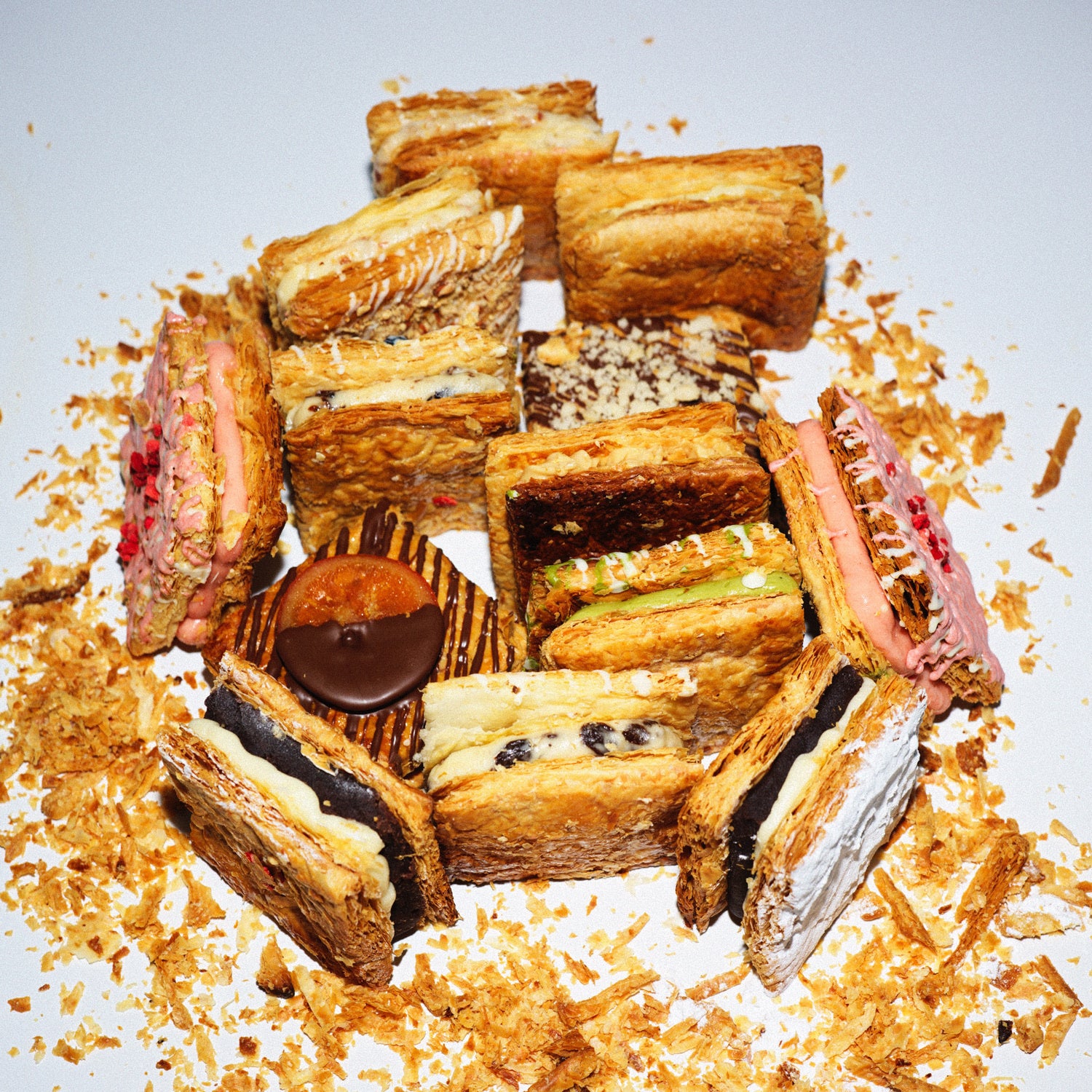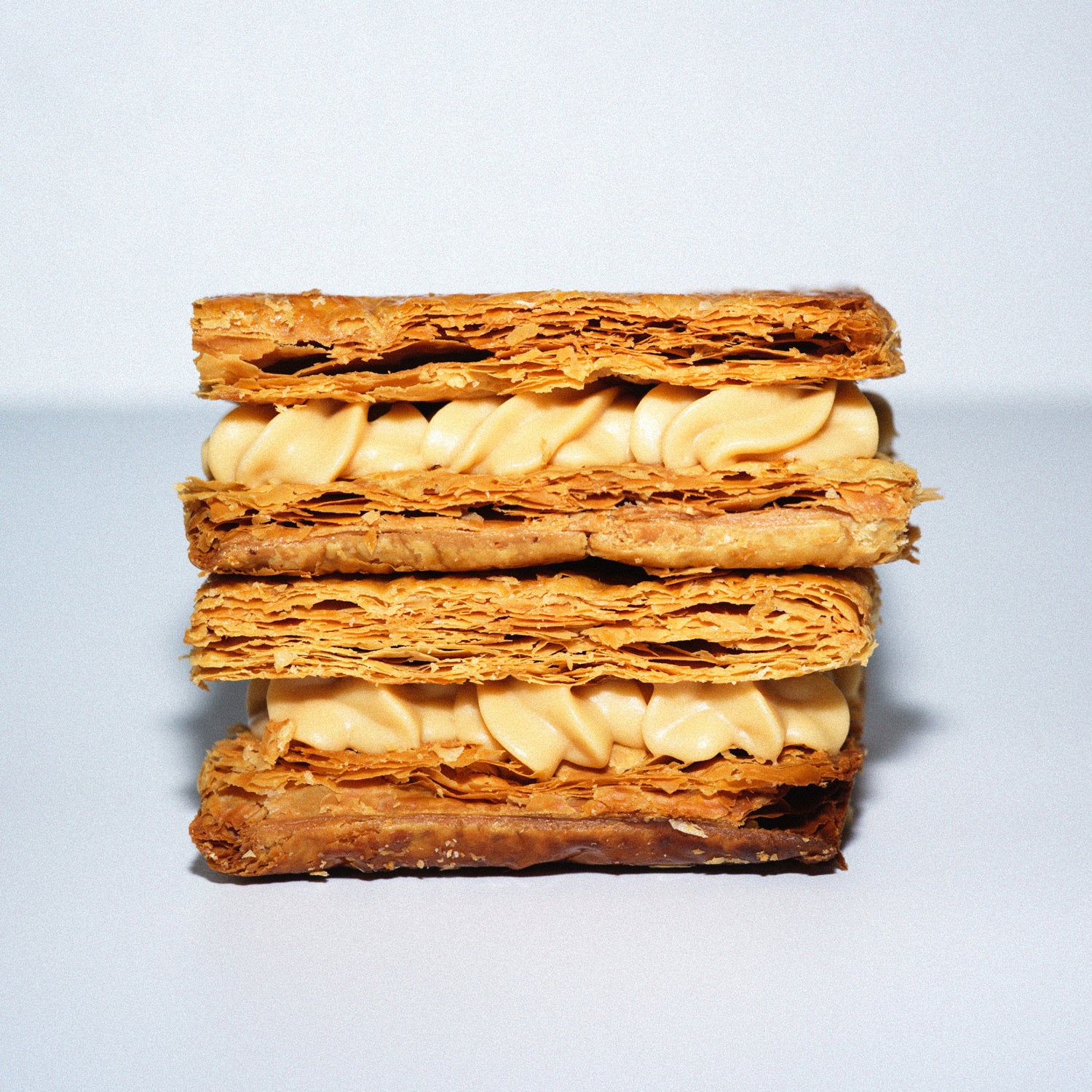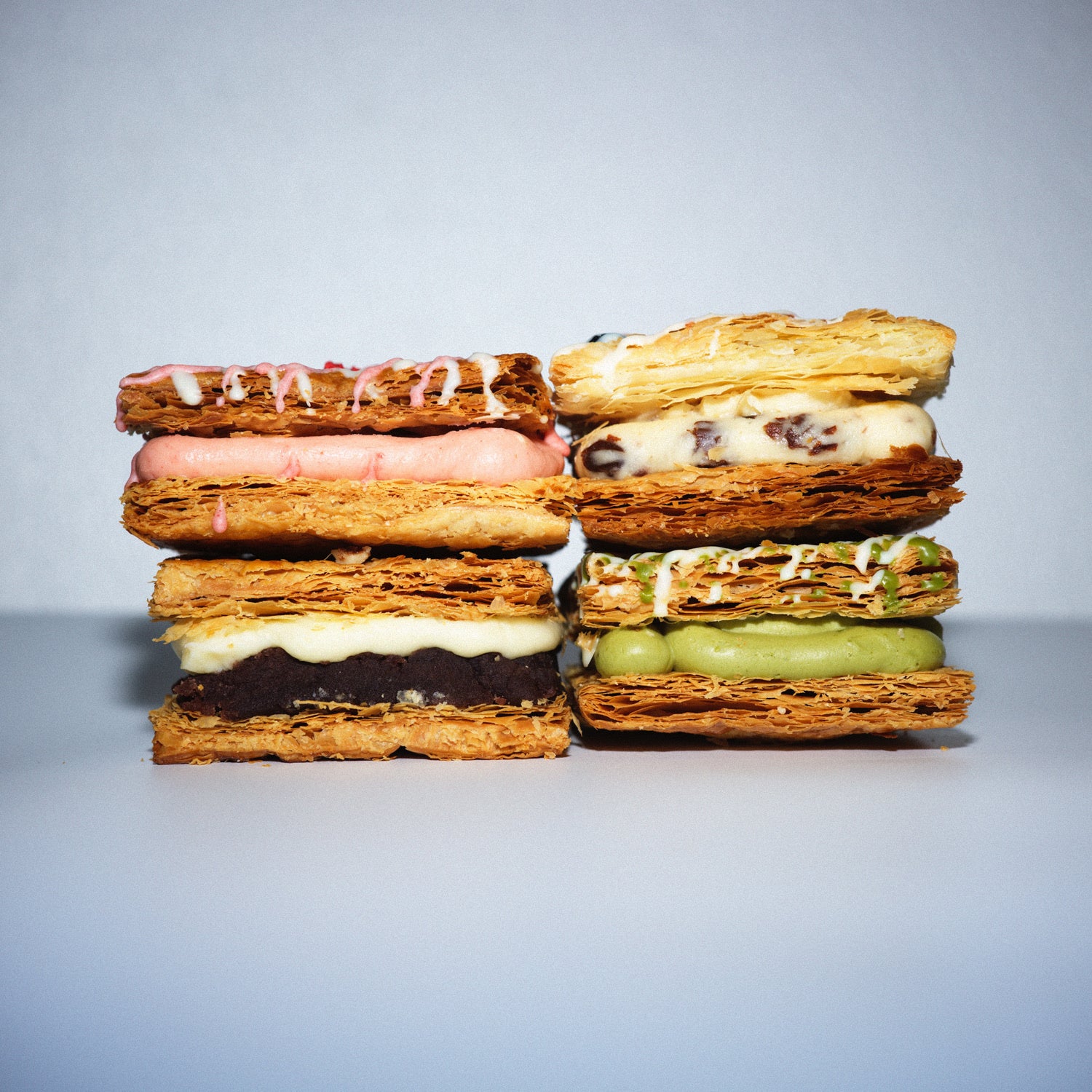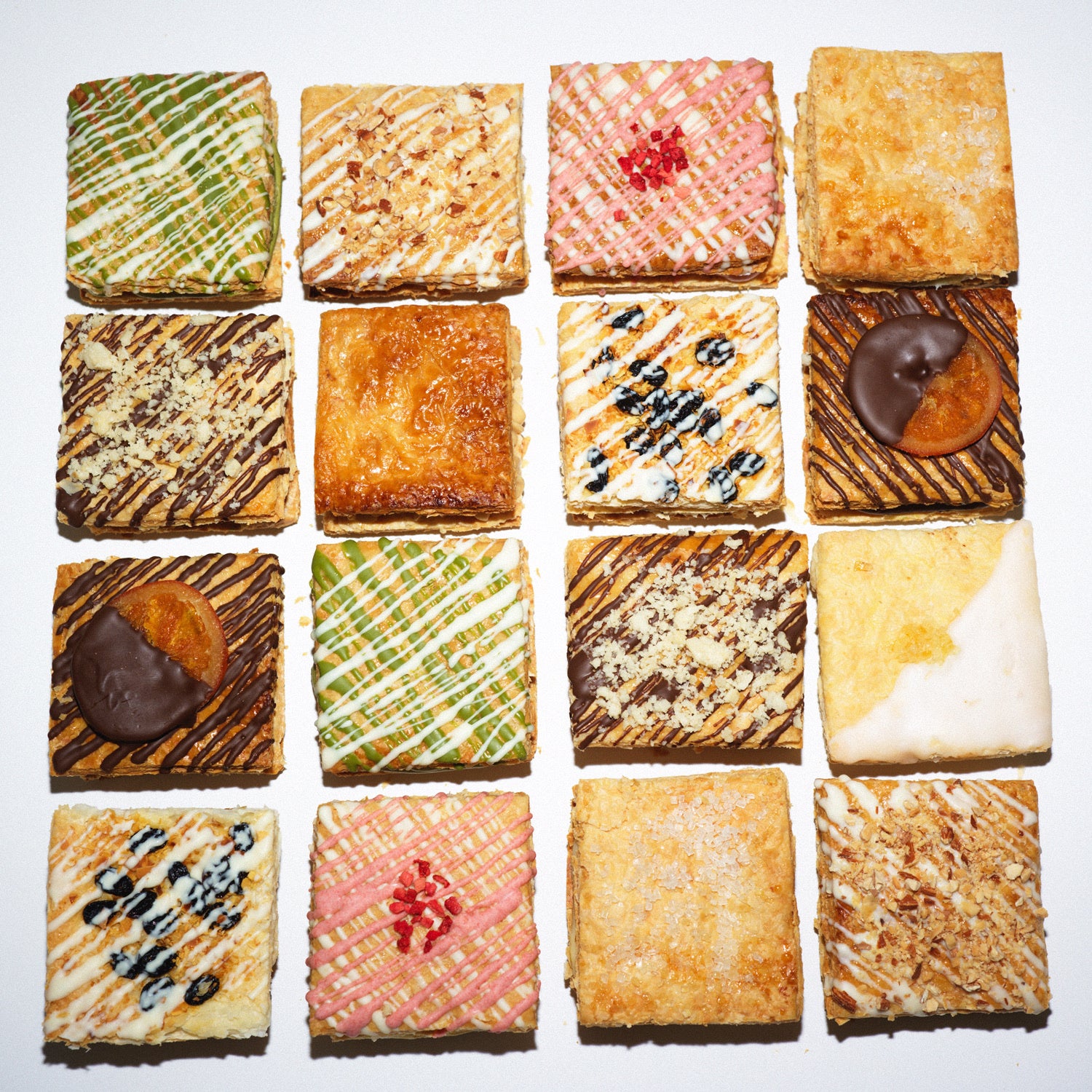 計12人の出演者が参加するこのパイケーキ。1つの大きさは9cm×9cmというボリューム。パイ生地は良質なバターを100%使用し、風味豊かな味わいに仕上がっています。また、さっくりと優しい口当たりでクリームとの相性もバッチリ。サクサクの食感がクセになります。パイとパイの間に挟むクリームには、バター、クリームチーズ、生クリームなど、濃厚でコクのある材料を使用。何度も試作を繰り返し、パイ1種類ごとの味が最大限に引き立つ配合で、12種類の全く異なる味を楽しんで頂けます。