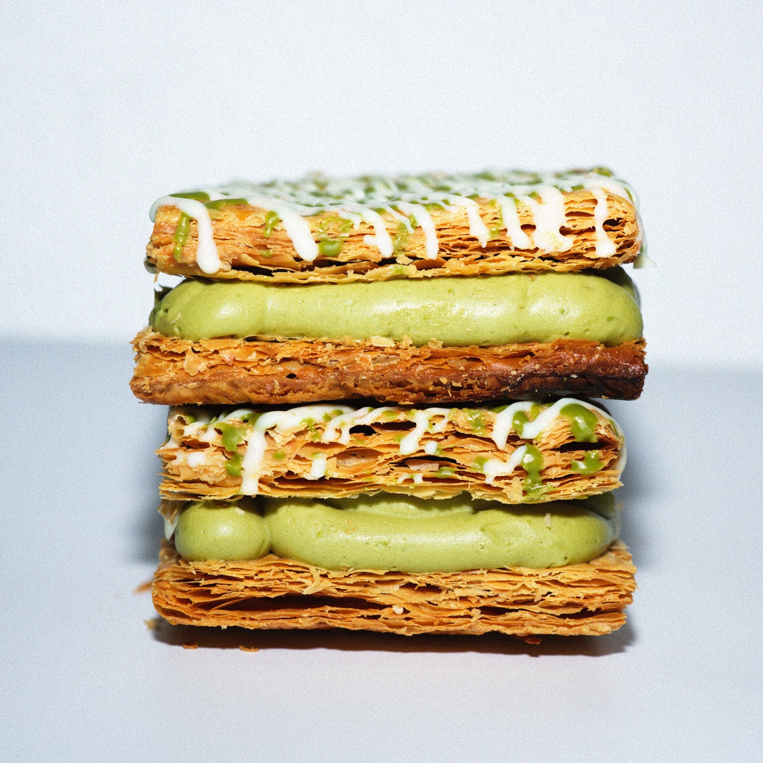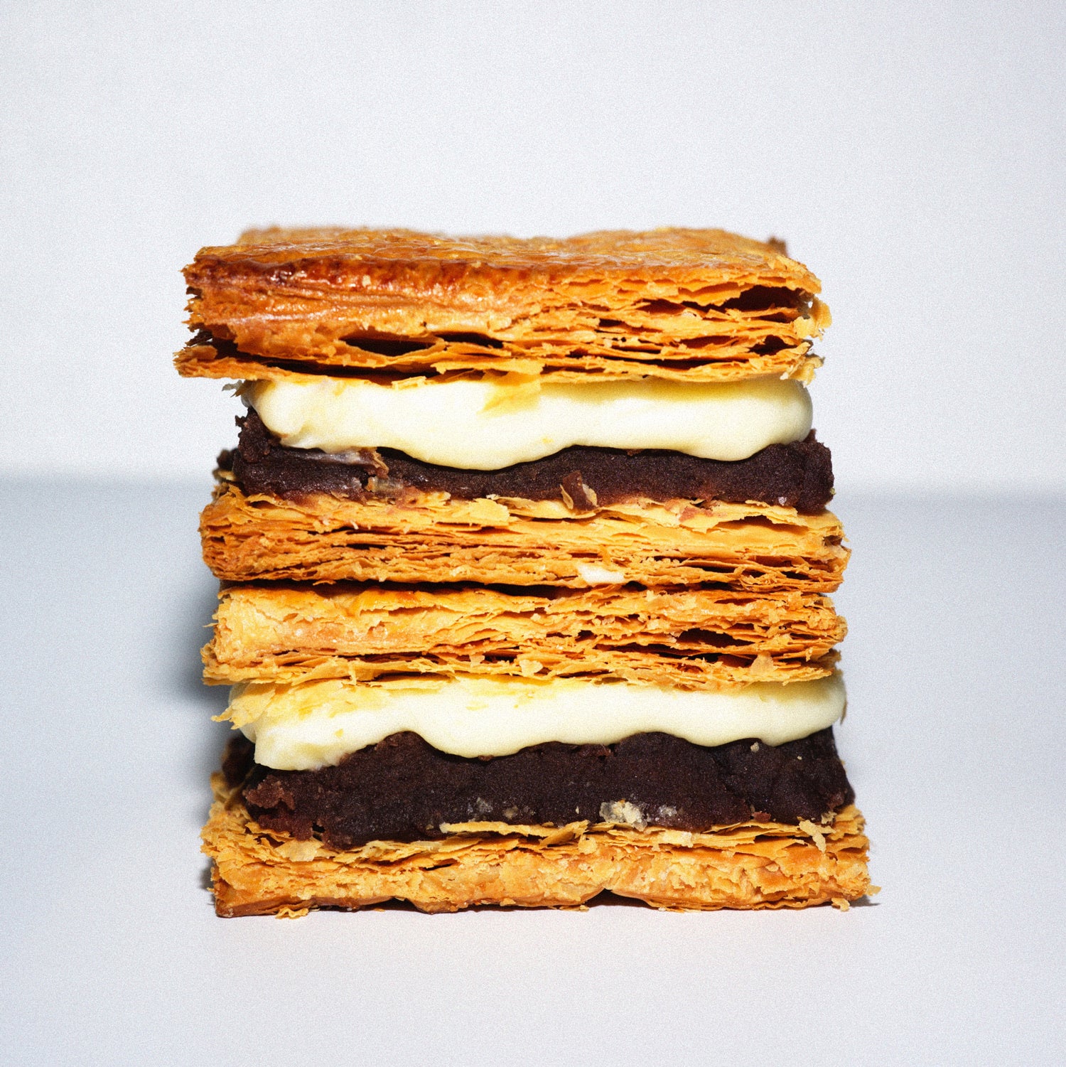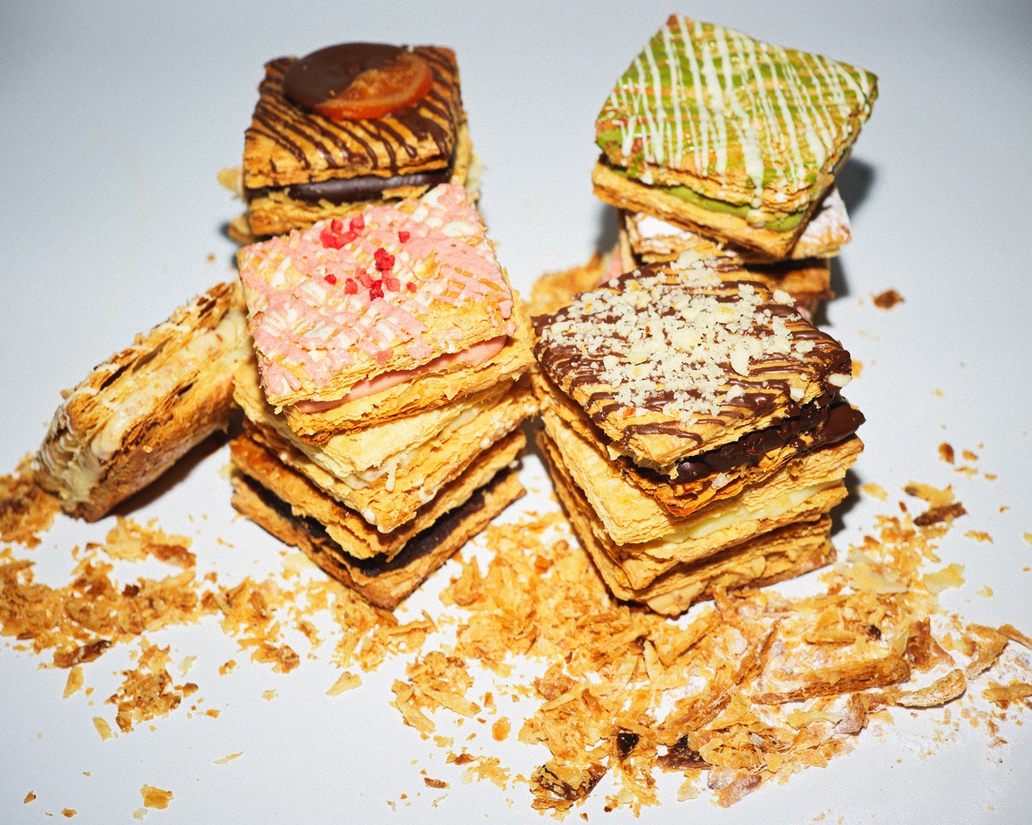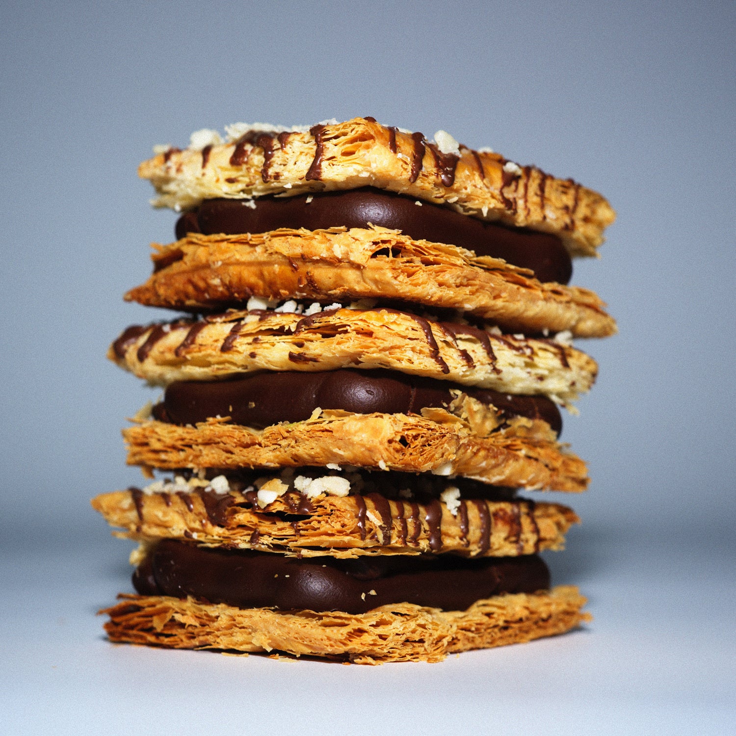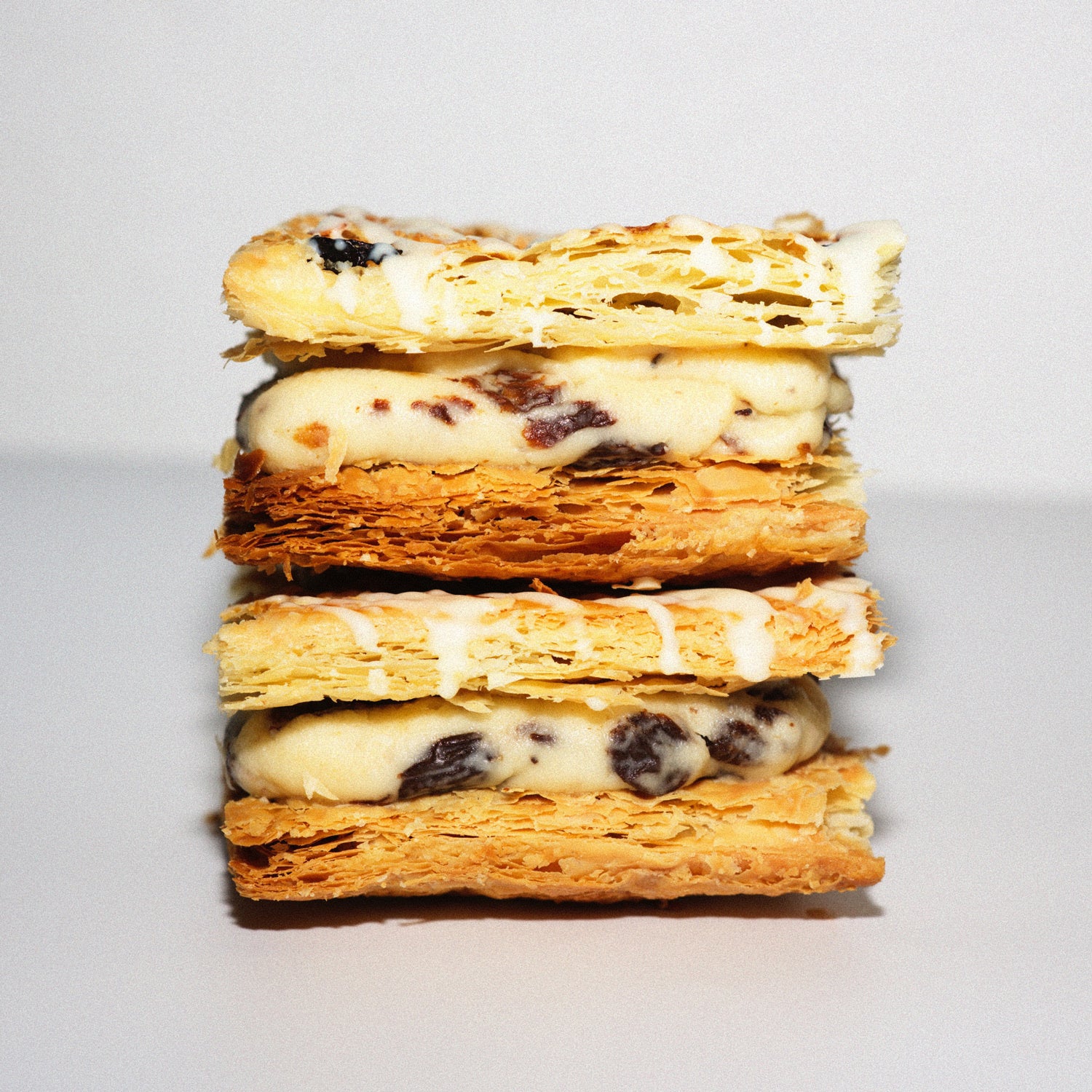 計12人の出演者が参加するこのパイケーキ。1つの大きさは9cm×9cmというボリューム。パイ生地は良質なバターを100%使用し、風味豊かな味わいに仕上がっています。また、さっくりと優しい口当たりでクリームとの相性もバッチリ。サクサクの食感がクセになります。パイとパイの間に挟むクリームには、バター、クリームチーズ、生クリームなど、濃厚でコクのある材料を使用。何度も試作を繰り返し、パイ1種類ごとの味が最大限に引き立つ配合で、12種類の全く異なる味を楽しんで頂けます。