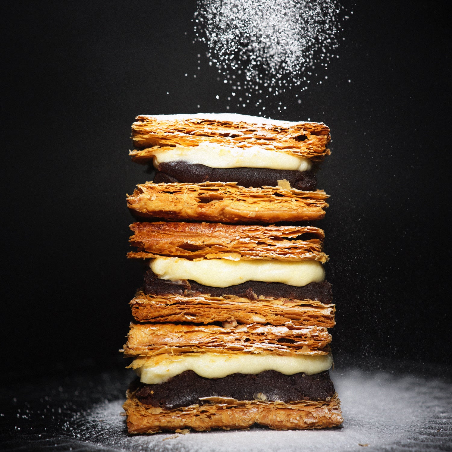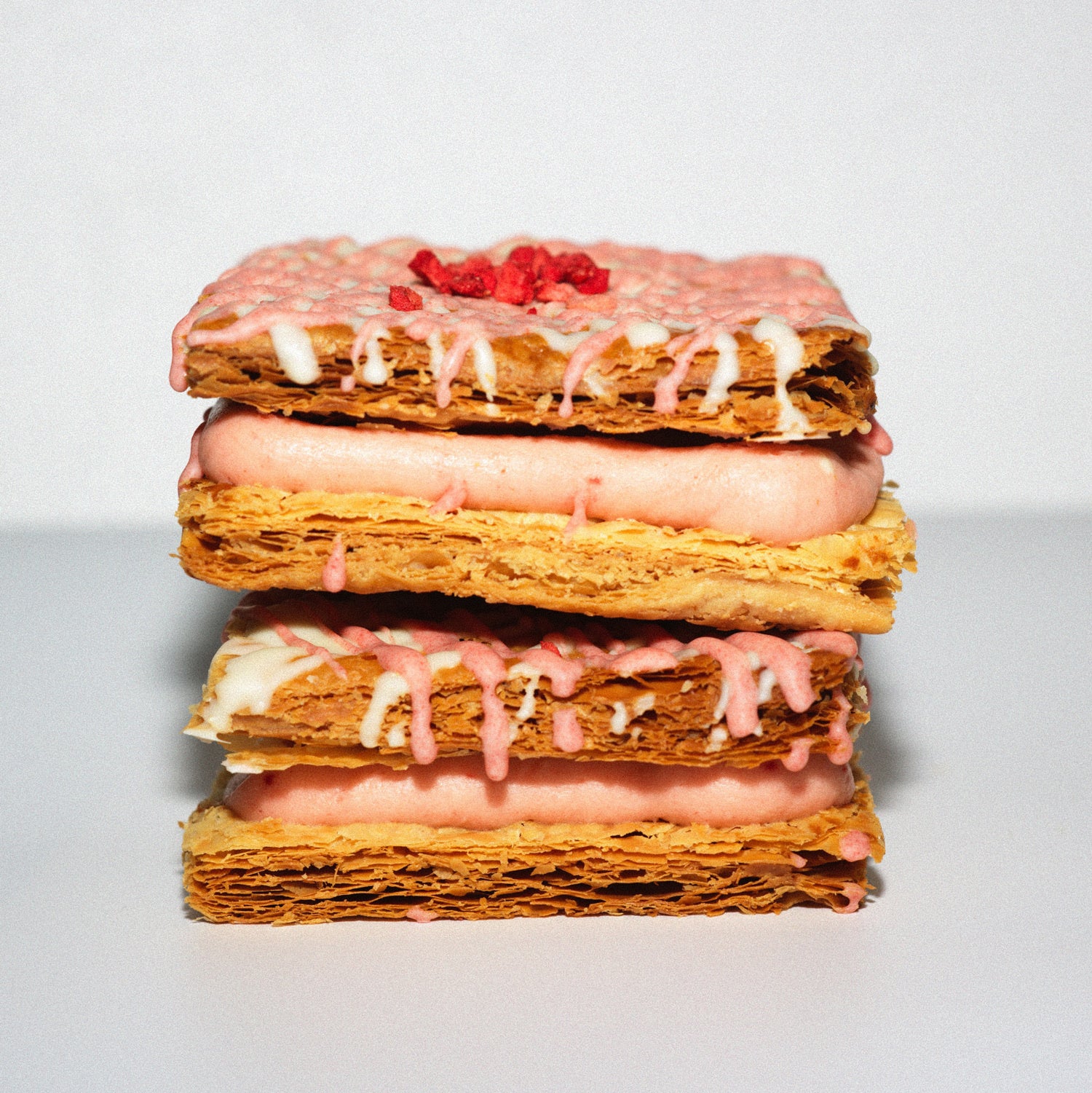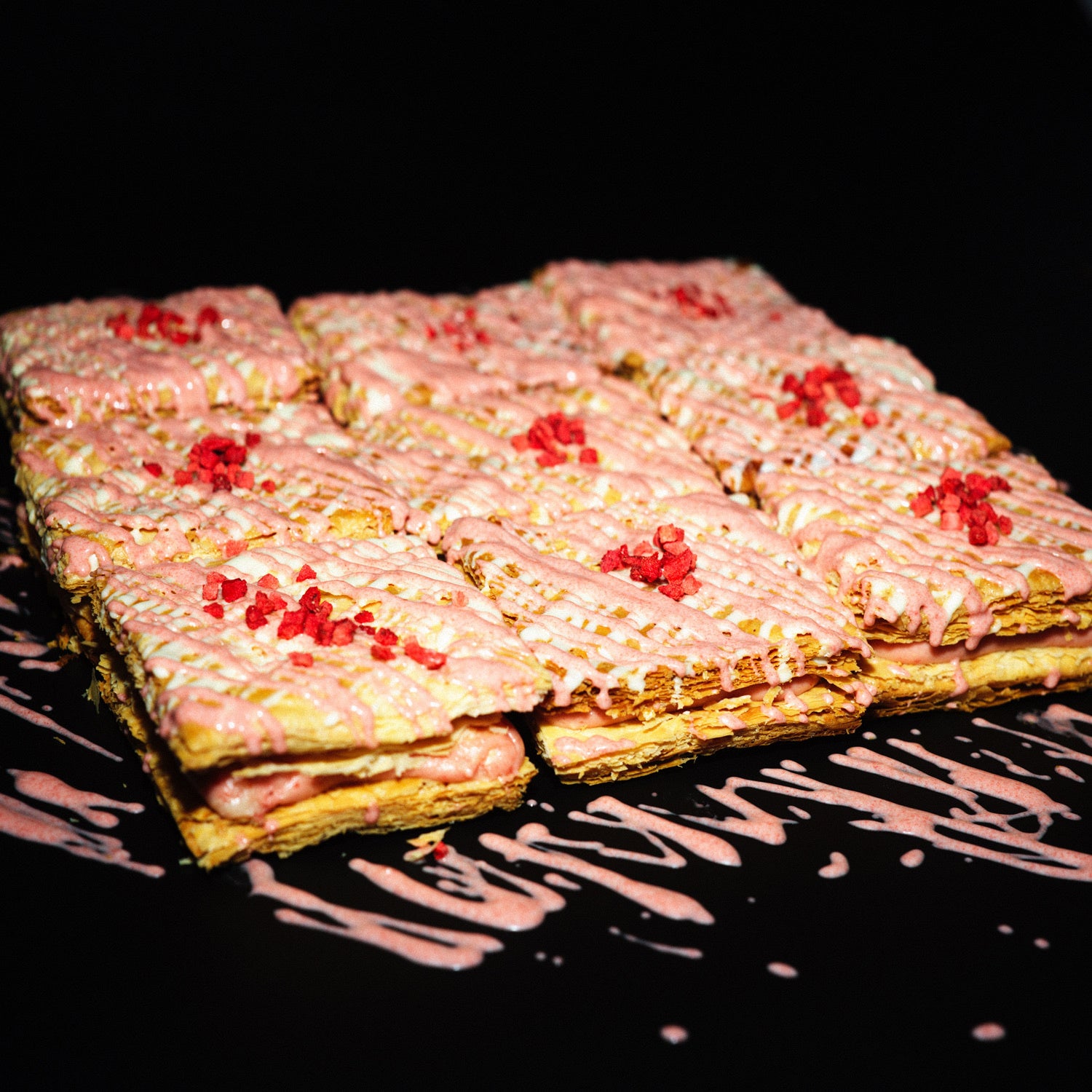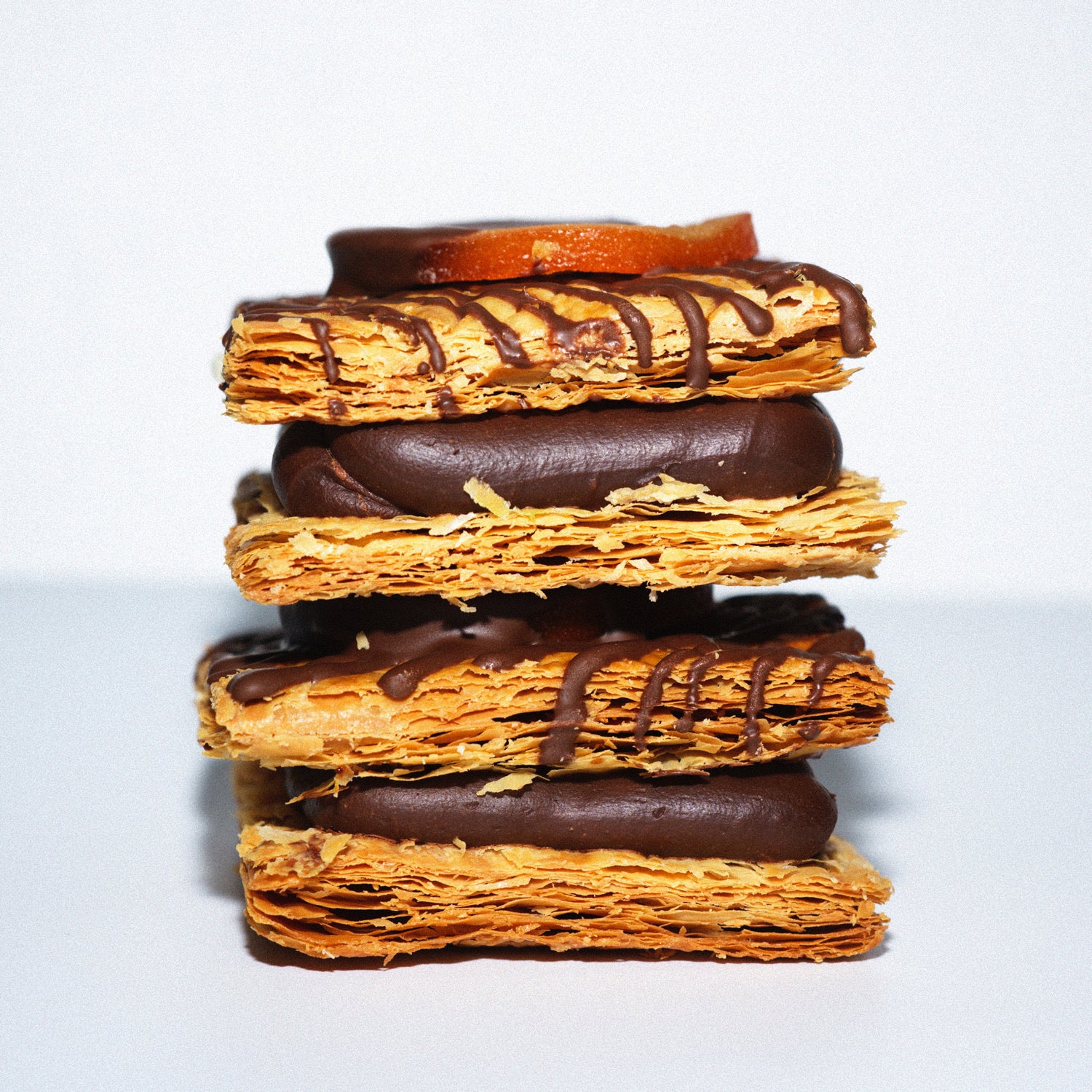 計12人の出演者が参加するこのパイケーキ。1つの大きさは9cm×9cmというボリューム。パイ生地は良質なバターを100%使用し、風味豊かな味わいに仕上がっています。また、さっくりと優しい口当たりでクリームとの相性もバッチリ。サクサクの食感がクセになります。パイとパイの間に挟むクリームには、バター、クリームチーズ、生クリームなど、濃厚でコクのある材料を使用。何度も試作を繰り返し、パイ1種類ごとの味が最大限に引き立つ配合で、12種類の全く異なる味を楽しんで頂けます。