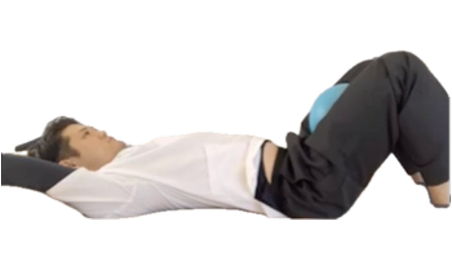 ドローインとは(図3)のようにやるのが一般的ですが産後の女性は、特にインナーユニット(腹横筋、多裂筋、横隔膜、骨盤底筋)を最大限に活動させるため(図4)の様に、手をバンザイさせ(肋骨を開かせ、横隔膜を働かせる)、股の間にボールを挟んだ状態で(内転筋を締めて骨盤底筋を働かせる)鼻から大きく息を吸い(お腹が膨らむ)、口から息を吐く。(お腹が凹む)この時、注意するのは一度に強く息を吐くのではなく、ストローから息を吐くように細く長く息を吐ききることが重要となります。(10秒〜15秒くらいかけて)