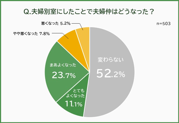 「夫婦別室にしたことで夫婦仲がどうなったか」という質問には、「変わらない」と回答した人が52.2%で半数以上。また「よくなった」と「悪くなかった」を比べると、「よくなった」という人のほうが多くなっています。