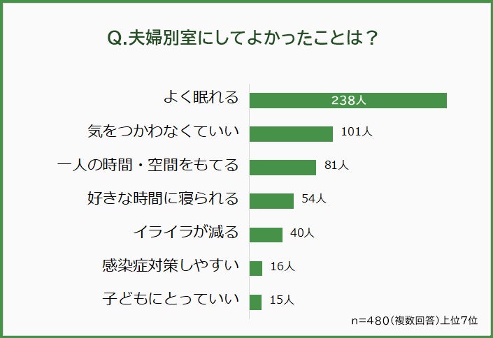 「夫婦別室にしてよかった」と答えた480人に「よかった理由」を聞いたところ、圧倒的1位は「よく眠れる(238人)」、次ぐ2位は「気をつかわなくていい(101人)」でした。「配偶者が出す音で起きてしまう人」にとっても、「自分が出す音で配偶者を起こしてしまい申し訳なく思っている人」にとっても、夫婦別室はメリットがあるのですね。
