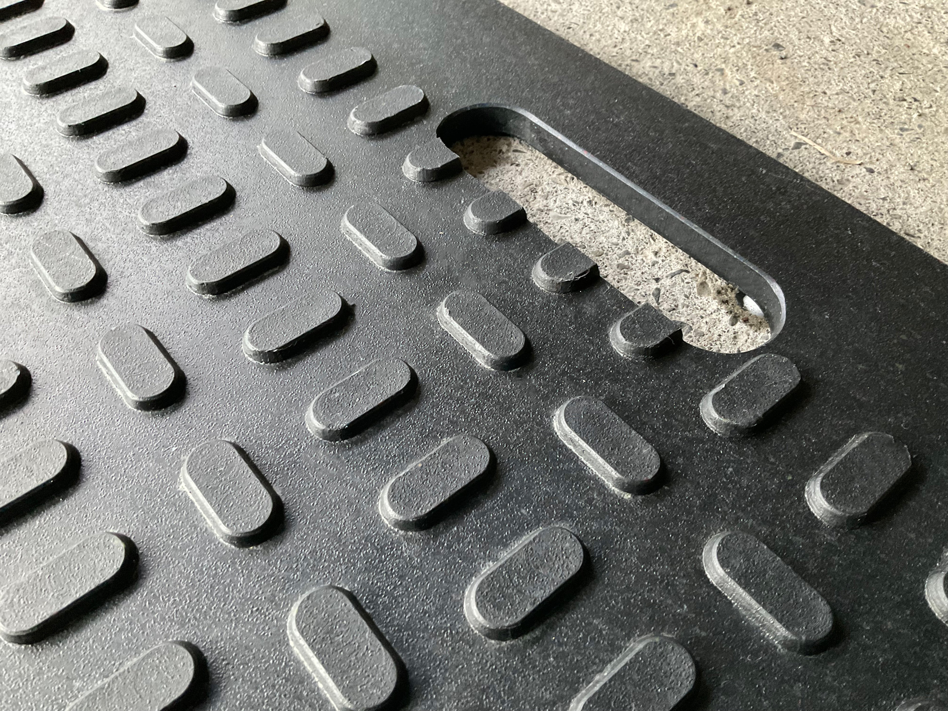 「V-MAT」は、立体的な楕円(オーバル)を交互に並べたオーバルすべり止めを採用しました。地面をしっかりつかみ敷板がズレない、タイヤがスリップしにくい、かつ、歩行にも適しているすべり止めです。