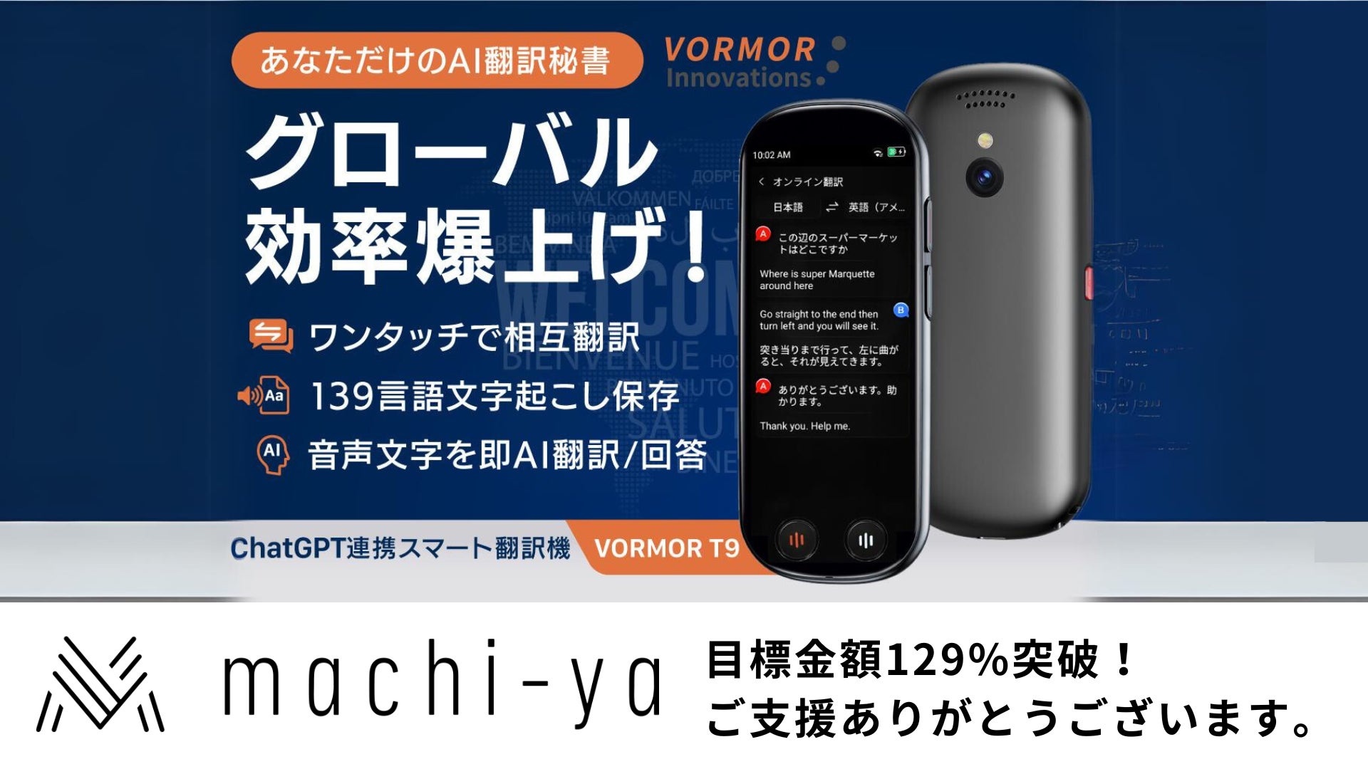 業界初※1のChatGPT連携機能が話題のスマートAI翻訳機「VORMOR T9」がmachi-yaで目標金額の129%を突破!