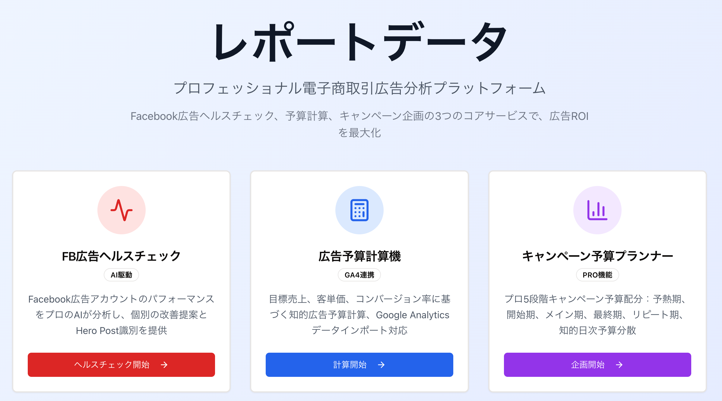 FacebookおよびInstagram広告はますます複雑化しており、広告主はキャンペーンの効果的な最適化に苦労しています。従来の分析ツールは、実行可能な洞察を提供せず、複雑な指標を広告主が手動で解釈する必要がありました。「レポートデータ」は、AIを活用した診断レコメンデーションを提供し、生データを戦略的な行動計画に変換することでこの課題を解決します。