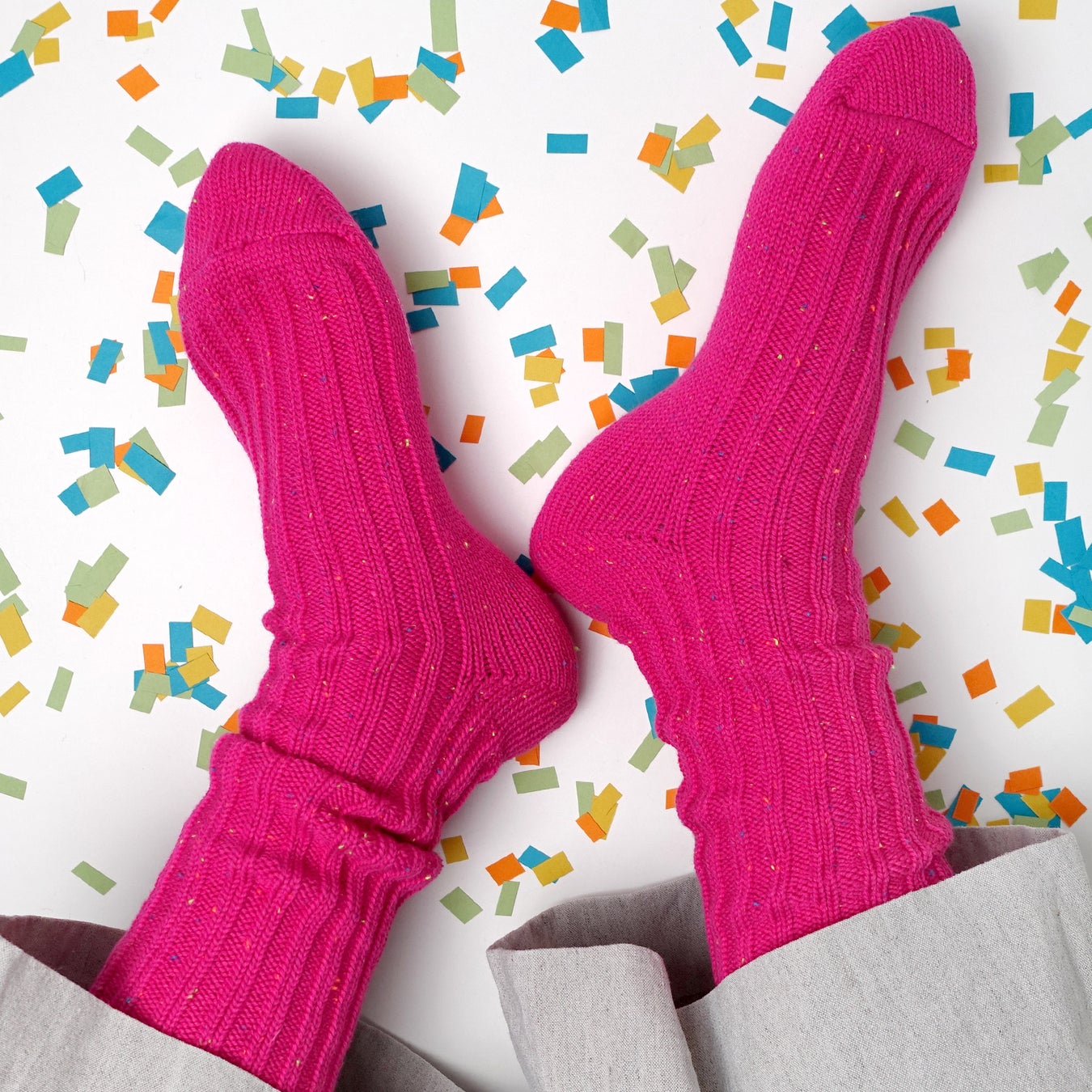 ふんわりとした履き心地が人気の「SOUKI SOCKS/Puffy-パフィ-」を、S.Laboの誕生花である「冬牡丹」から着想したオリジナルカラーで染め上げた糸で編み上げました。カラフルでワクワクするようなピンク色にカラフルなネップが散りばめられた靴下はS.Laboのテーマである「くつ下を楽しむ」にぴったりなカラーリングです。創喜が培ってきた技術を活かしてローゲージのリブ編み機でゆっくりと編み上げた、ふっくらと包み込むような履き心地を楽しんでいただけます。