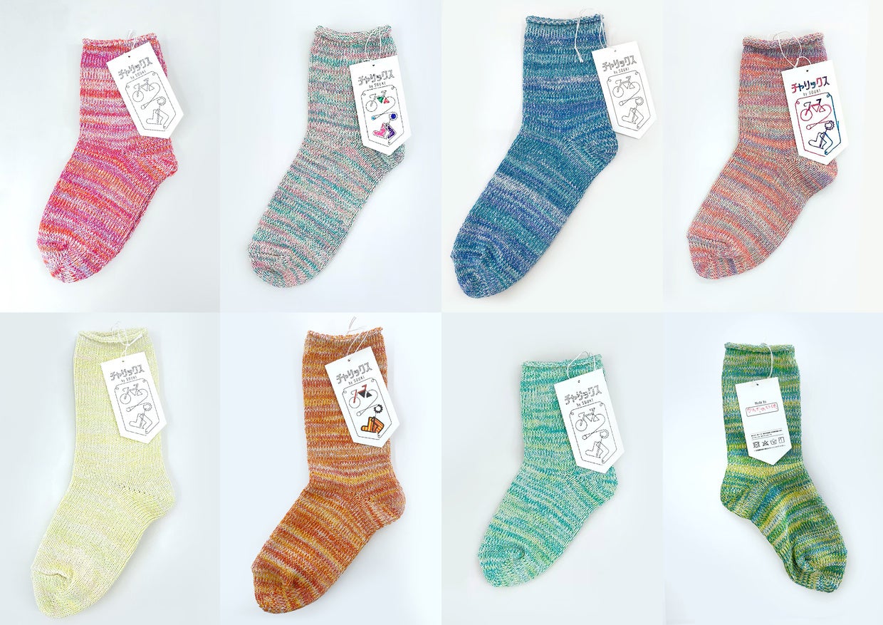 自転車を漕いで靴下を編む「チャリックス」の常設スペースでは、靴下製造の一連の工程を体験しながら、自分だけの靴下を作ることができます。壁に飾られた36色の綿の糸から3色を選び、自転車を約15分漕ぐと完成。お好みのサイズや丈も選べます。クリスマスやハロウィンの時期には、季節に合わせたウール糸やラメ糸などを期間限定でご用意しています。
