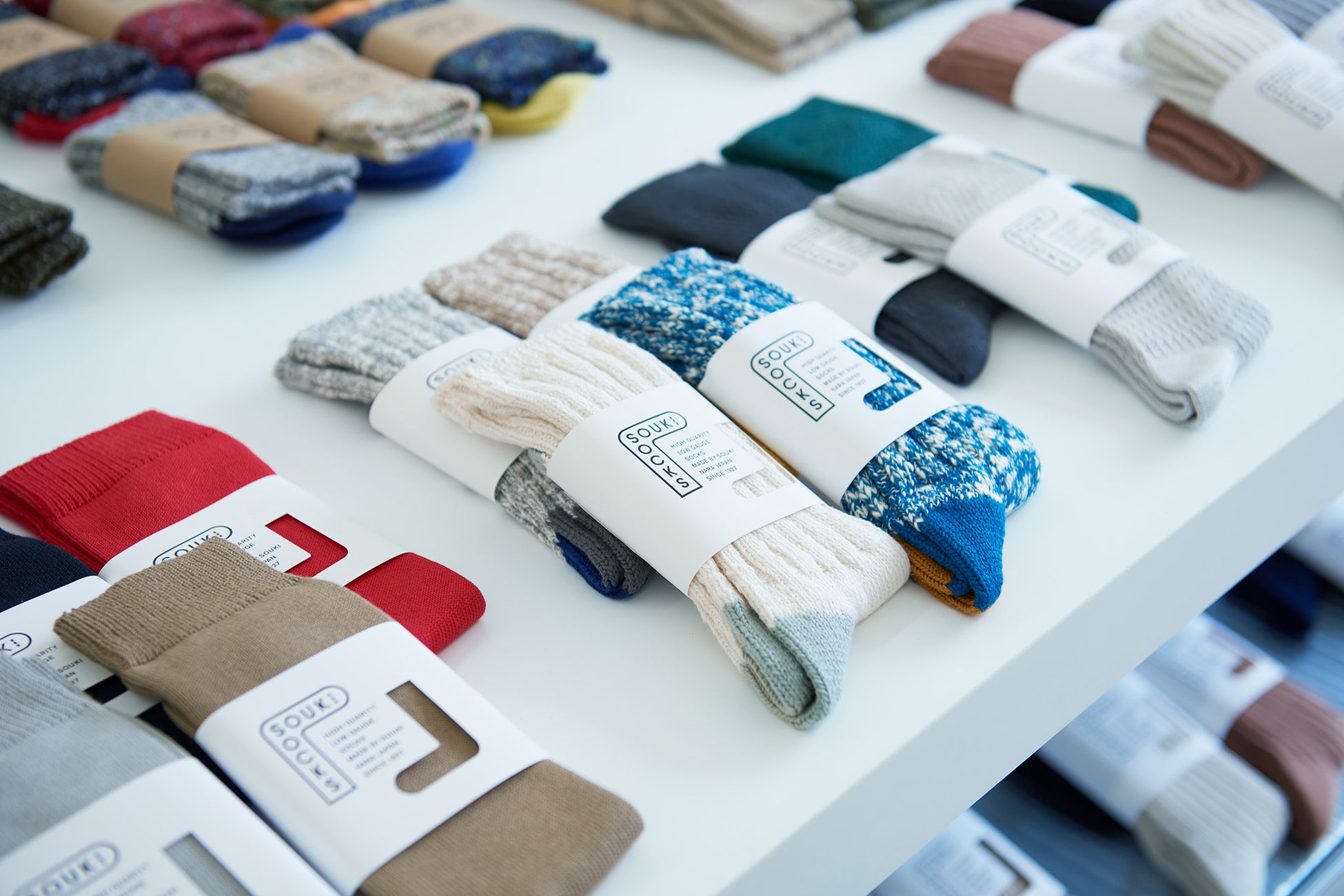創喜の自社ブランドが並ぶショップスペースです。大きな編み目で丈夫でふっくらした履き心地が特徴のSOUKI SOCKSやRe Loopなど、さまざまな靴下を実際に手に取ってご覧いただけます。不定期でS.Labo限定商品も販売。日本一の靴下産地である広陵町で、創喜のローゲージソックスをぜひお楽しみください。