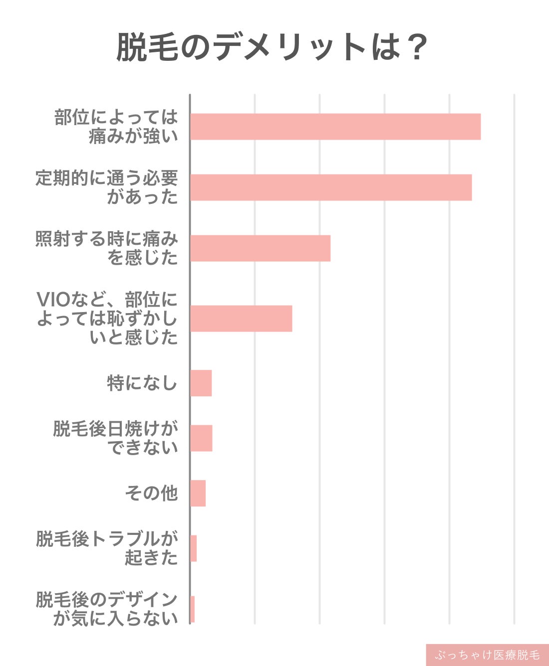 一方で脱毛のデメリットだと感じること1位は、やはり費用面。特に学生や社会人歴の浅い方にとっては、まとまった出費が負担だと感じられたようです。また痛みや定期的に通う必要性をデメリットに感じる女性も多くいました。
