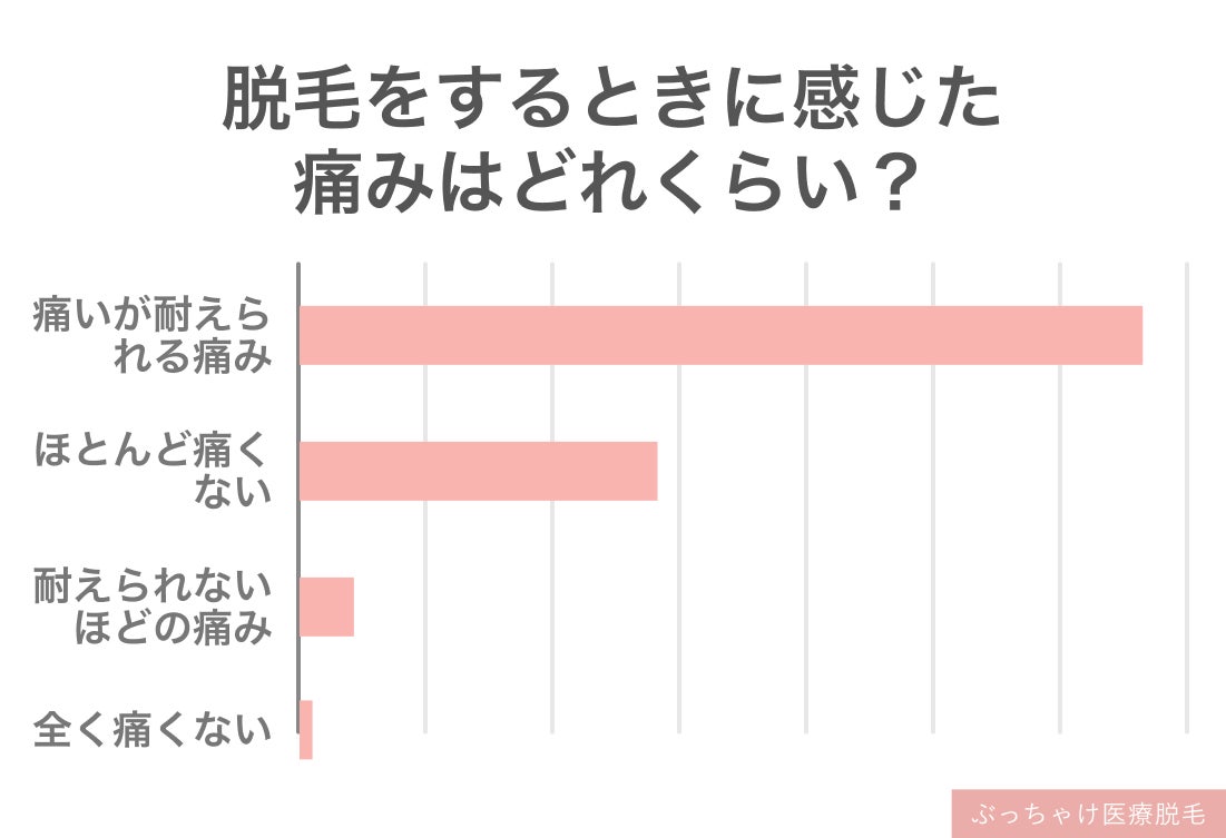 耐えられるほどの痛みだと回答した女性がほとんどで、「クリニックにもよるが、痛み具合に応じて照射レベルの調整が可能」という声もありました。また痛みの例えとして「全く感じないわけではないが、感じるとしてもゴムで弾く程度の刺激」と回答した女性もいました。