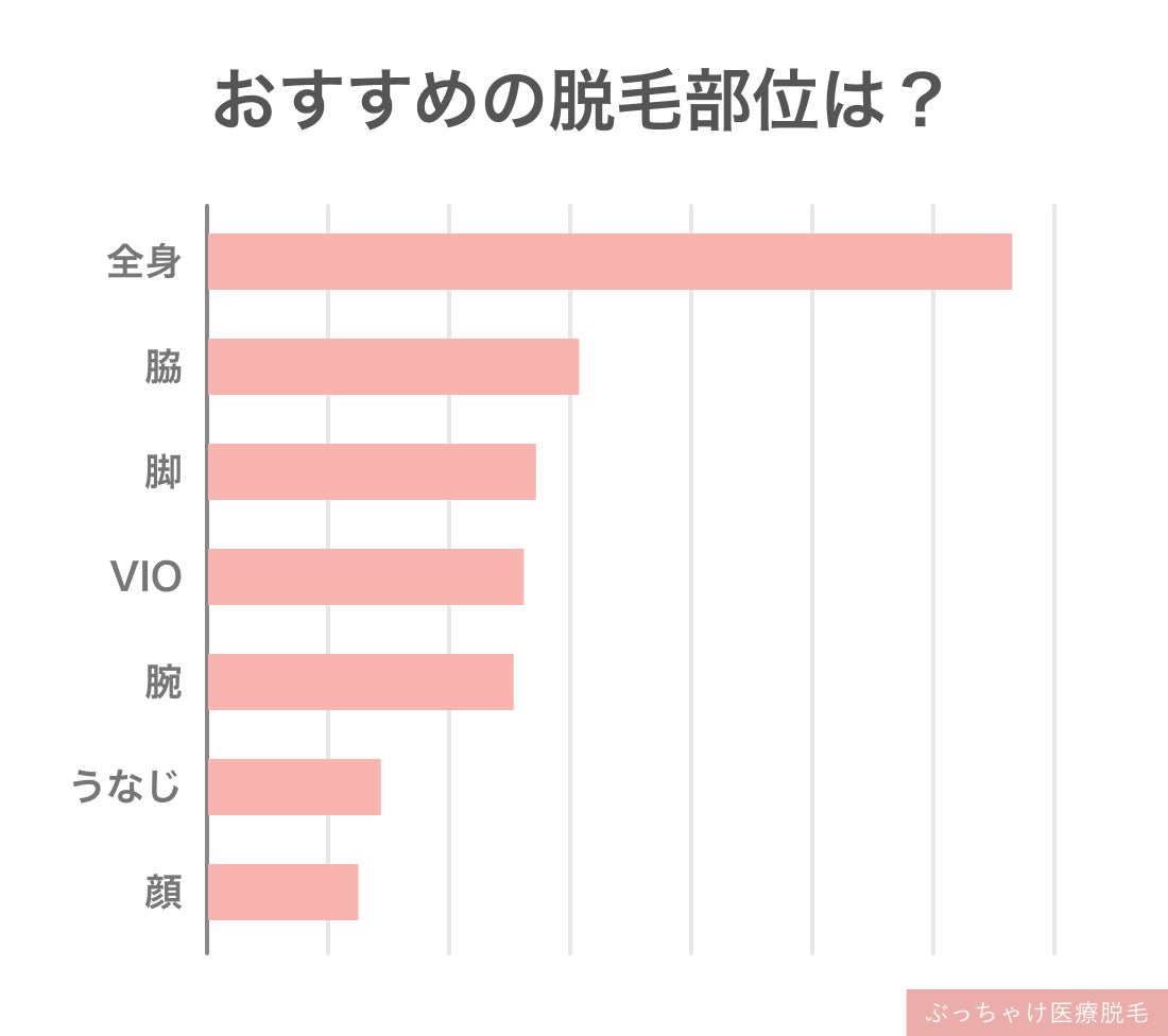 おすすめの部位は、「全身」という回答が圧倒的でした。どうせ通うなら一気に施術するのがおすすめと感じる女性が多くいました。次いで脇や脚、VIOがランクインしました。