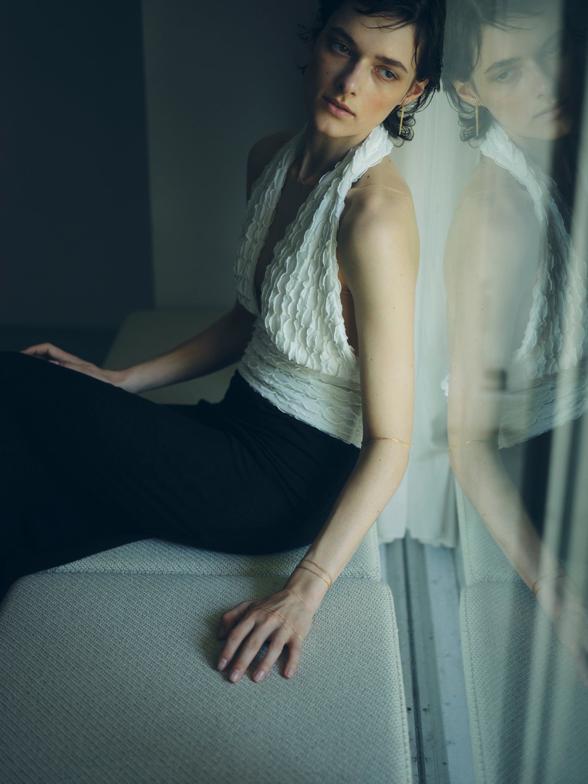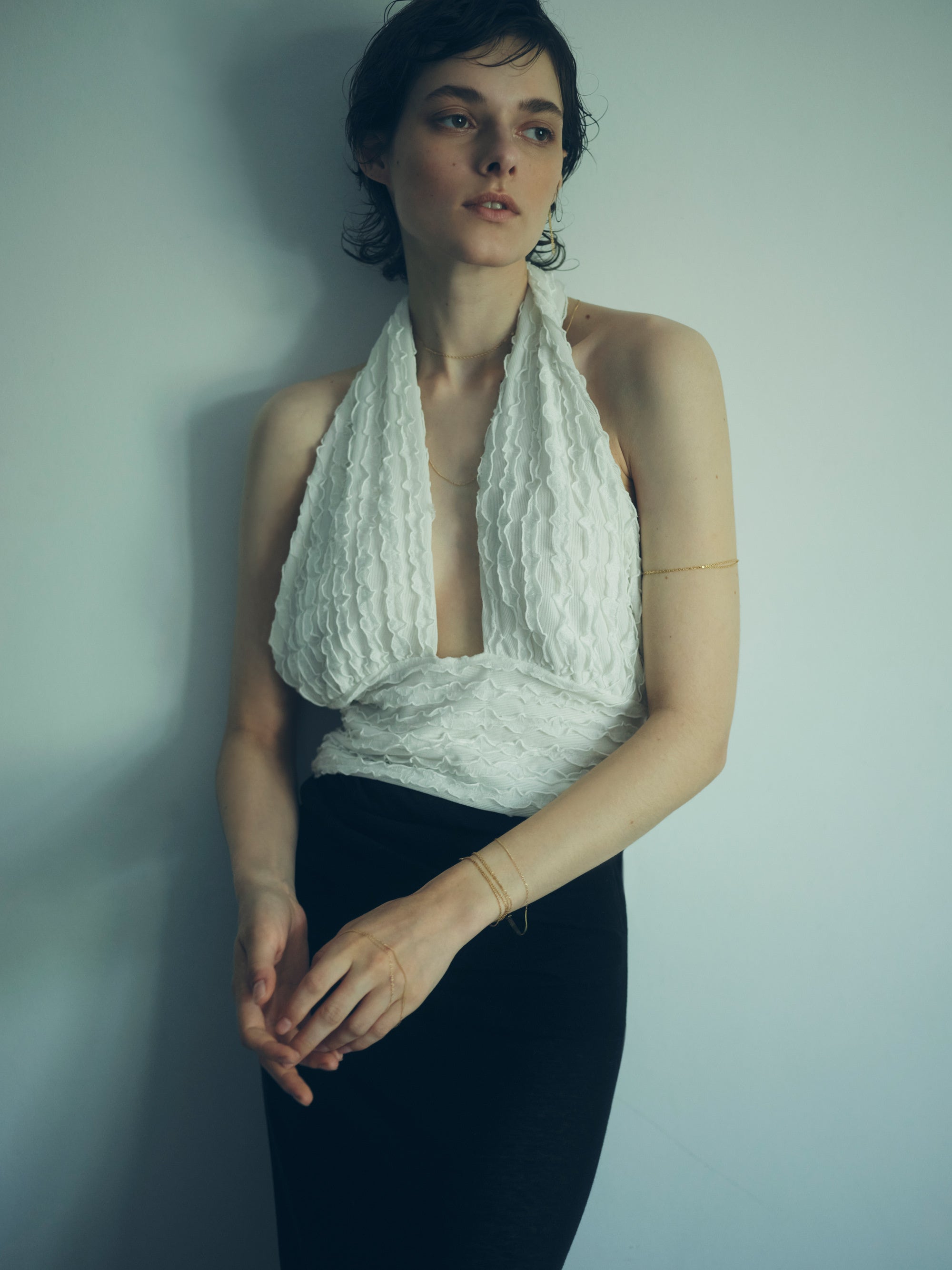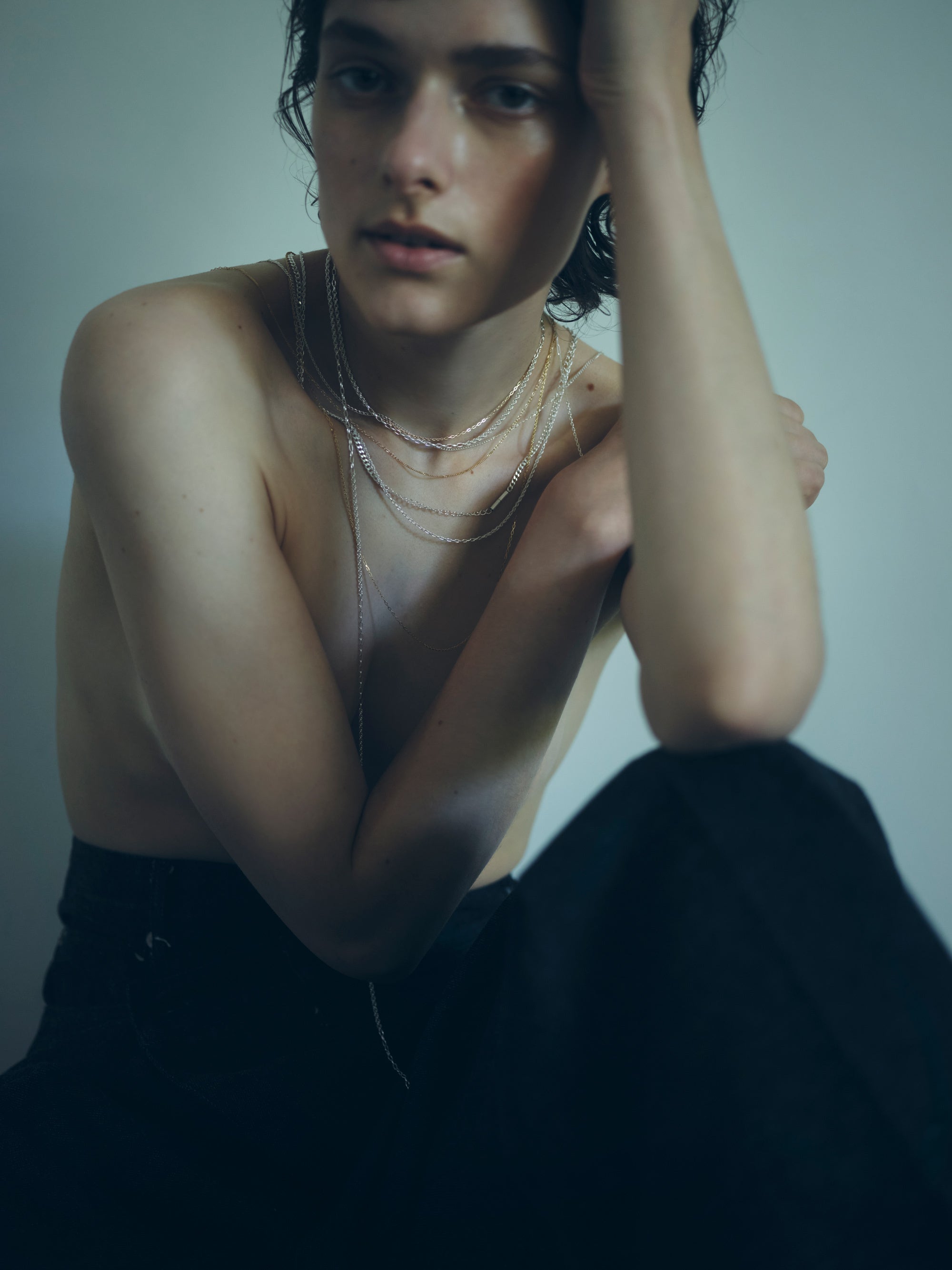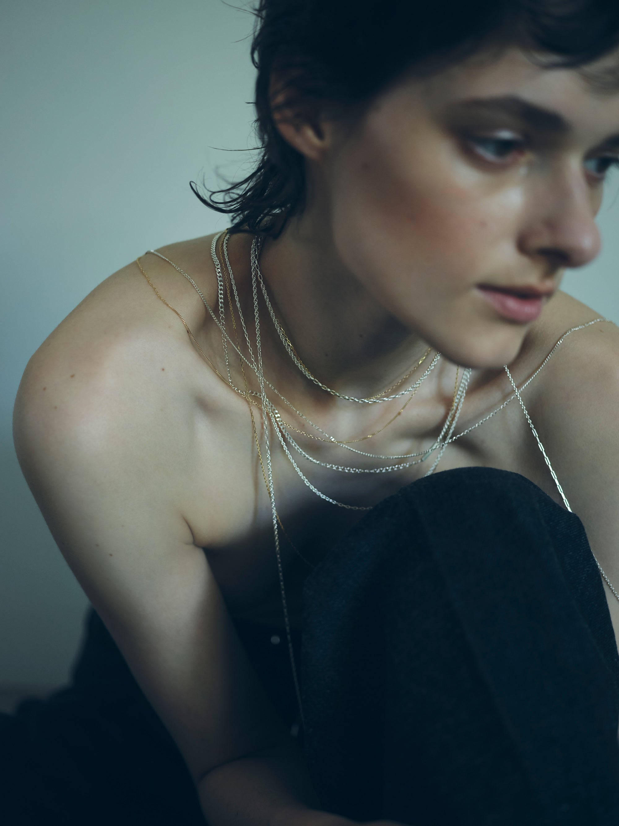 シンプルなフォルムは、単体でも、他のジュエリーとの重ね付けでも楽しめる汎用性の高さが魅力です。〈density〉では、ネックレス、ピアス、ブレスレットをご用意。使うシーンやお好みに合わせて選べるよう、長さは3種類、チェーンの種類は太さや素材を変えた6種類をご用意しています。いずれも構造美と素材美が融合したデザインで、日常に自然と馴染みながらも、装いにさりげないアクセントを加えます。