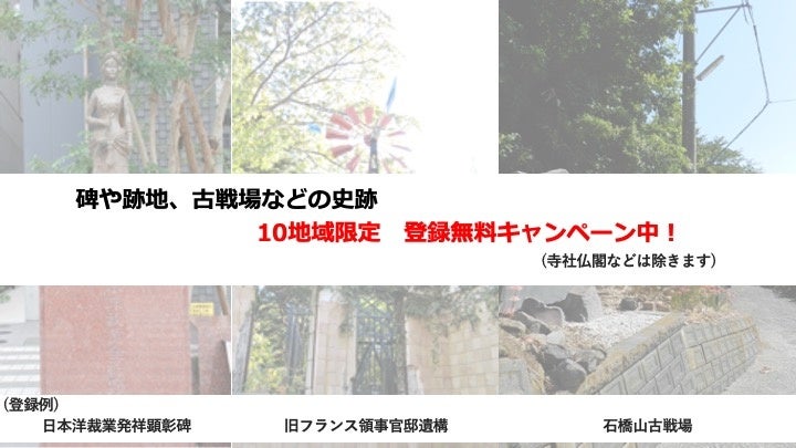 先着30社様に、碑や跡地、古戦場などの対象スポット(形の現存する城郭や寺社などは除きます)のコンテンツ制作が無料となるキャンペーンを実施いたします。対象となるスポットや上限数についてはお問い合わせください。