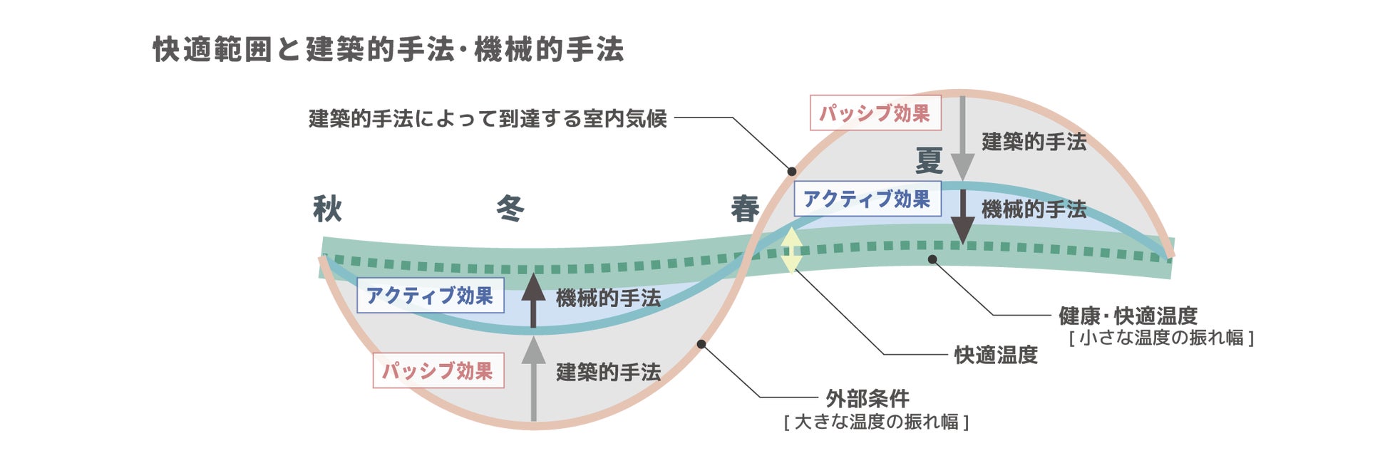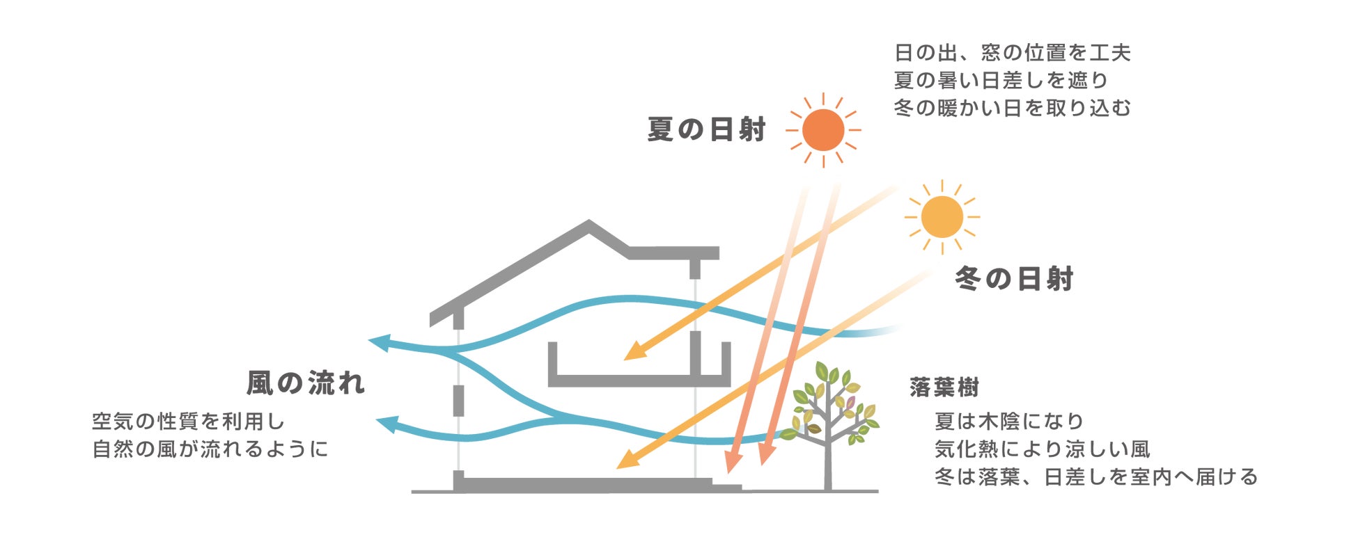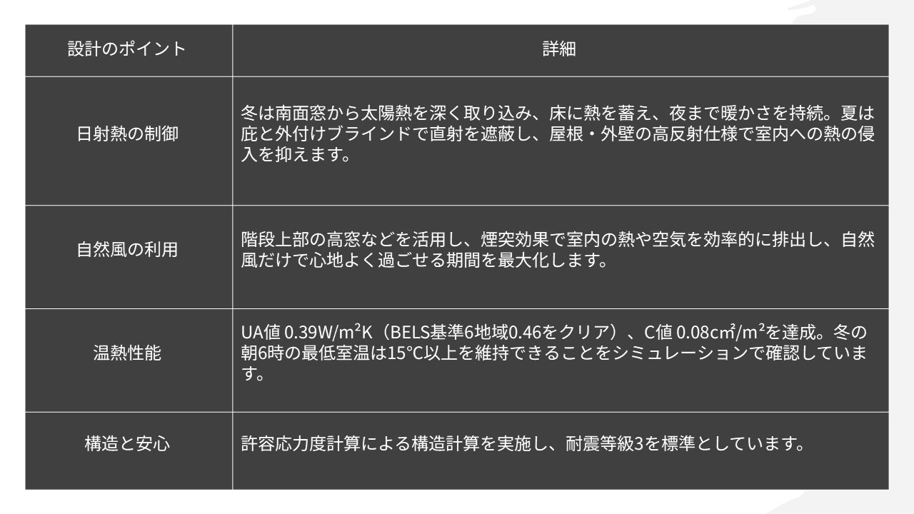 リアル・パッシブデザインの追求:単に数値をクリアするだけでなく、最も暑い時期(7〜8月)と最も寒い時期(1〜2月)の気象データを用いた日照・風解析シミュレーションを実施。平均値ではなく、現実の気候に基づき、自然エネルギーを最大限に活用できる設計を徹底しました。