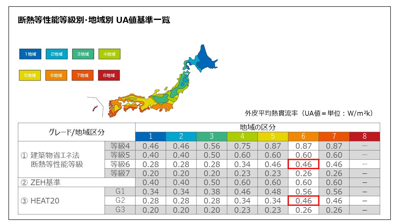 UA値(外皮平均熱貫流率)は、家から逃げる熱の量を示す、断熱等性能等級の最も重要な指標です。数字が小さいほど高性能で、全国を8つの気候地域に区分し、地域ごとに基準値が定められています。HEAT20 G2は、ZEH基準(等級5)を大きく上回る世界水準の高性能(等級6)であり、地域ごとの基準値と比較することで、その優位性がわかります。