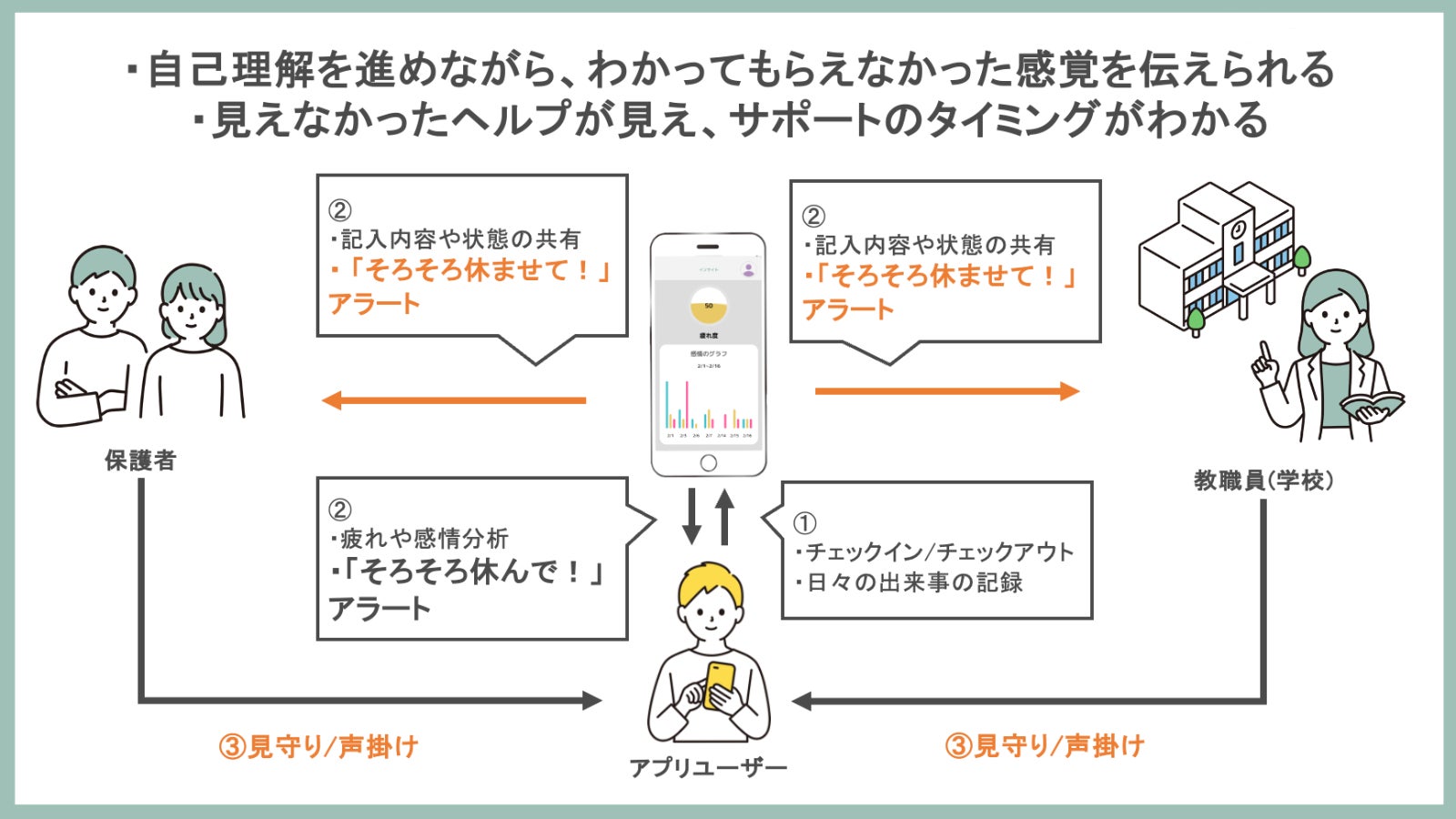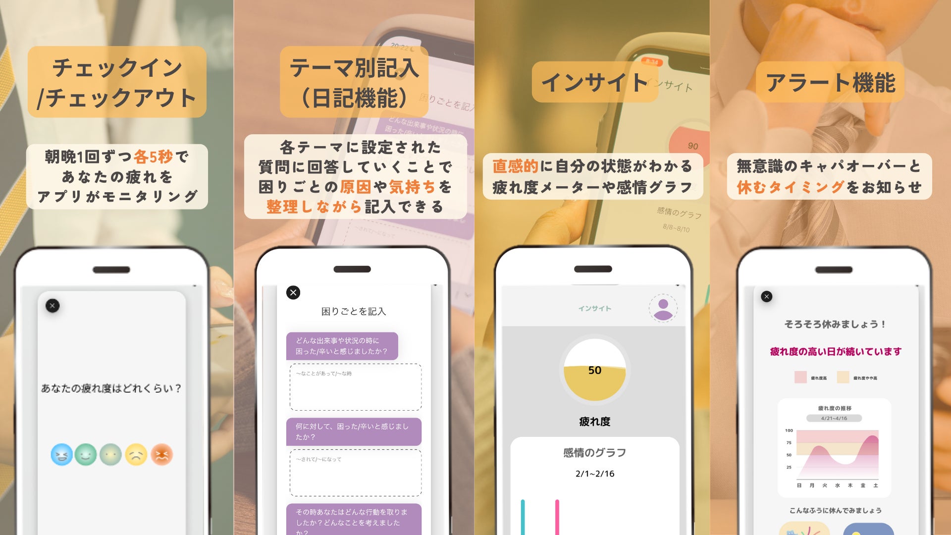 目に見えない疲れをぽちっと入力しておくだけで、何かあったら知っておいてほしい/助けを求めたいあの人に知っておいてもらえる。そして、何かあった時にも助けを求めやすくなる、そんなアプリです。