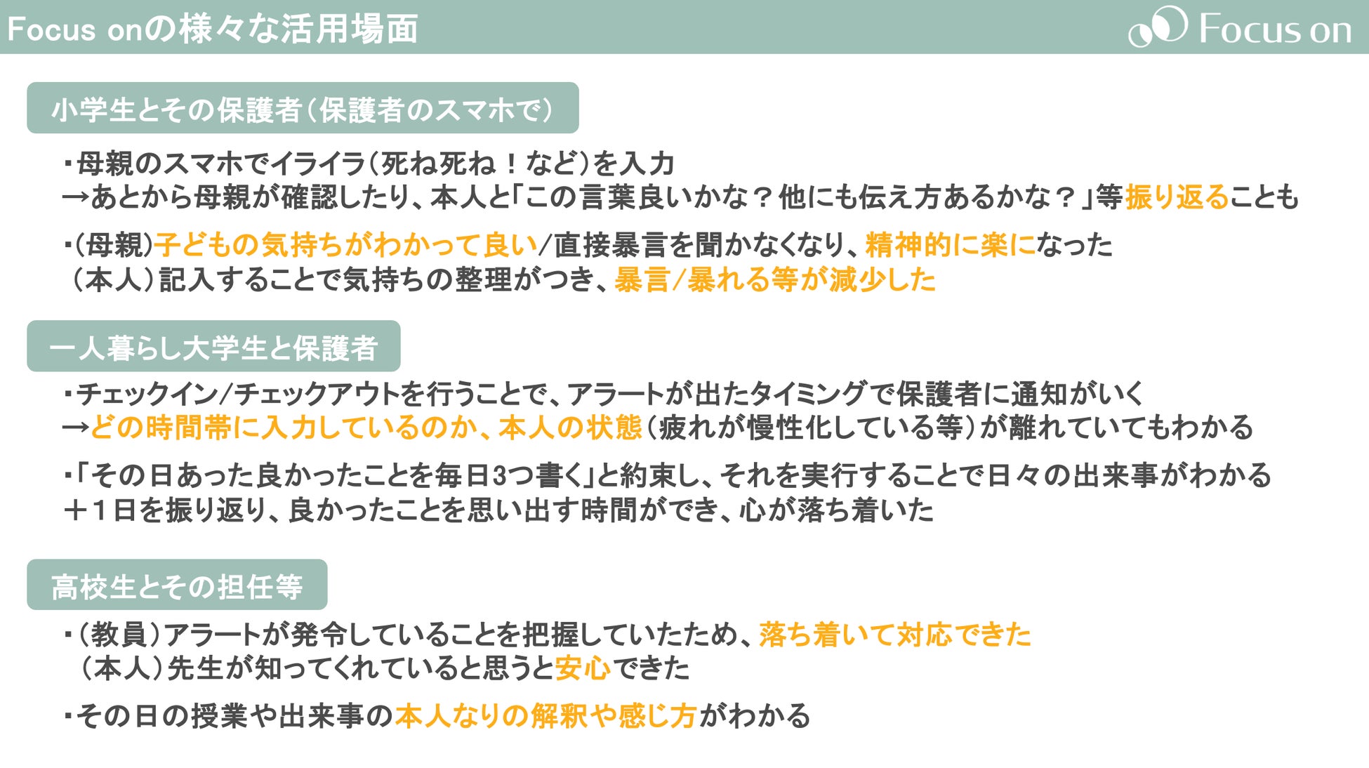 「Focus onを通してアプリユーザーの見ている世界を覗くことができた」という感想も届いています。以下はご活用いただいたケースの一部ですが、ぜひご紹介させてください。