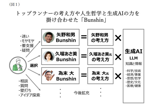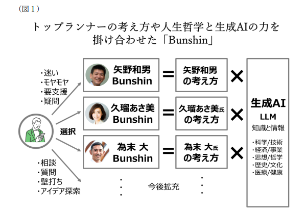 このため「Bunshin」により、生成AIのパワーを利用することで、普段は接することができない各分野の専門家やトップランナーの考え方や生きざまのこもったアドバイスが誰でも受けられます。これにより、高ストレス状況への対応、周りの人間関係の改善、仕事上の壁の突破、自己理解の深化など、仕事や人生のあらゆる場面で人に力を与える回答をします。