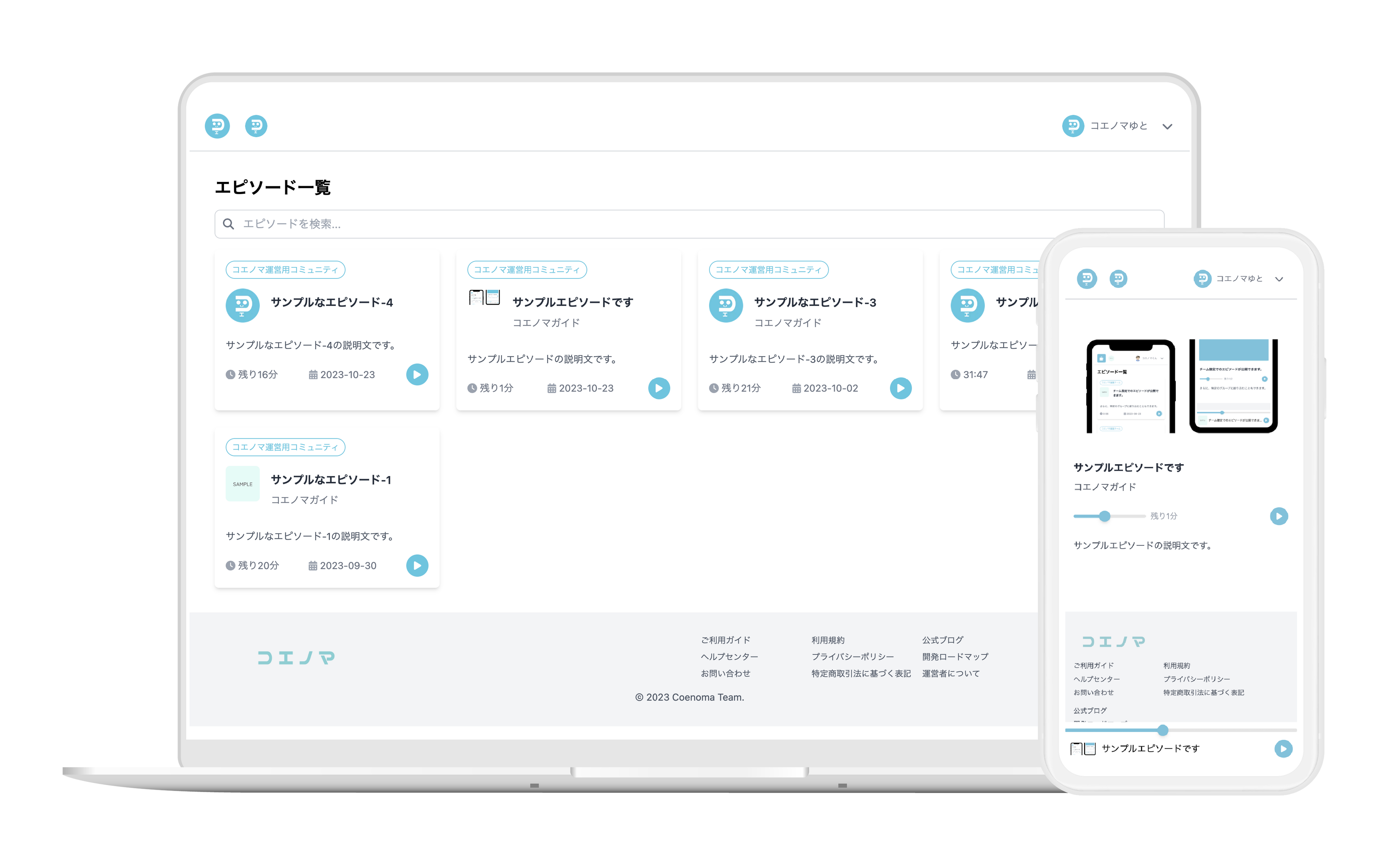 「コエノマ」は、特定のチームやコミュニティ内で音声コンテンツを限定配信できる、いちばん簡単なラジオ配信ツールです。聴きたいエピソードに簡単にアクセスできるアーカイブ機能や、テーマ別にコンテンツを整理できるプレイリスト機能を提供し、企業の社内ラジオやポッドキャスターの限定コンテンツ配信といった多様な用途でのコミュニケーションニーズに応えます。