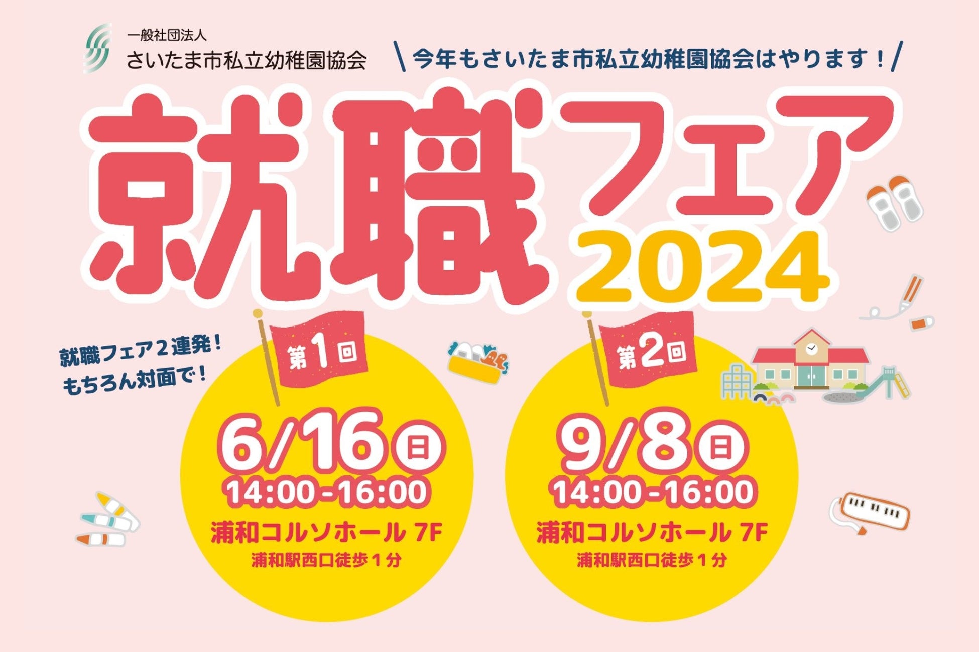 一般社団法人さいたま市私立幼稚園協会は、2024年6月16日(日)に浦和コルソホールにて「第1回就職フェア2024」を開催いたします。さいたま市の幼稚園・こども園の先生になりたい人(2025年新卒・既卒問わず)を対象とし、99園あるさいたま市の幼稚園・こども園の中の53園が各園ブースを設け、実際働かれている先生と気軽にお話できる機会となっております。一人15分ずつ個別で気兼ねなく相談が出来ます。より多くの園を回っていただくことで、それぞれの園の特徴や良さを知ることができる良い機会ですので、皆さん奮