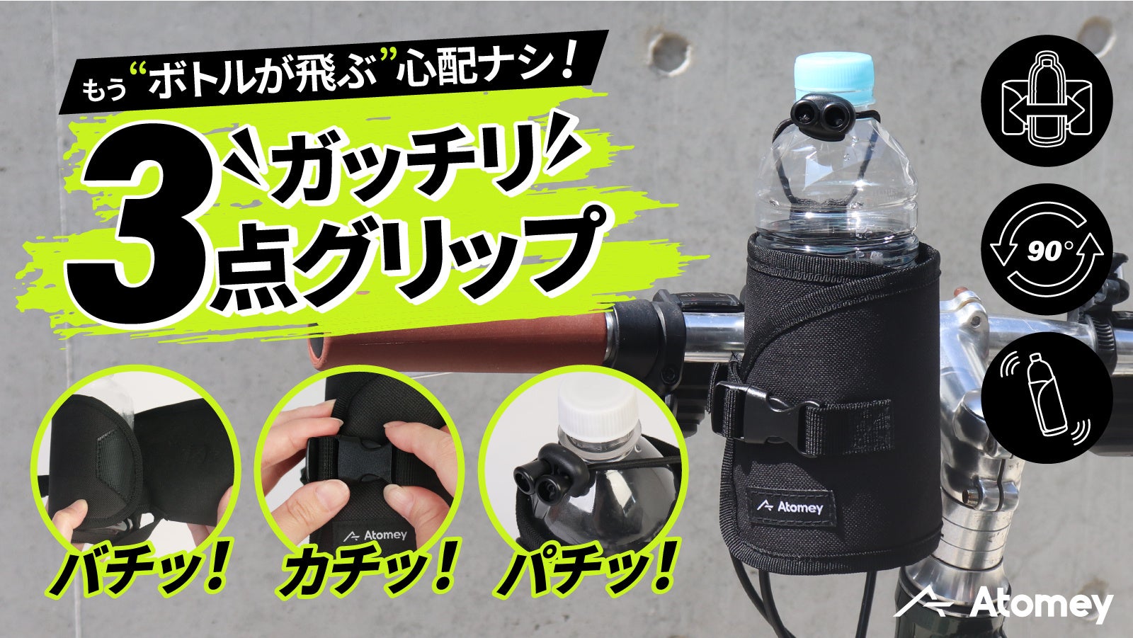 "3点グリップ"で運転中にボトルが飛ぶ心配ナシ!サイズが調整できる自転車用ボトルホルダー!Makuakeにて9月2日(月)より先行販売!