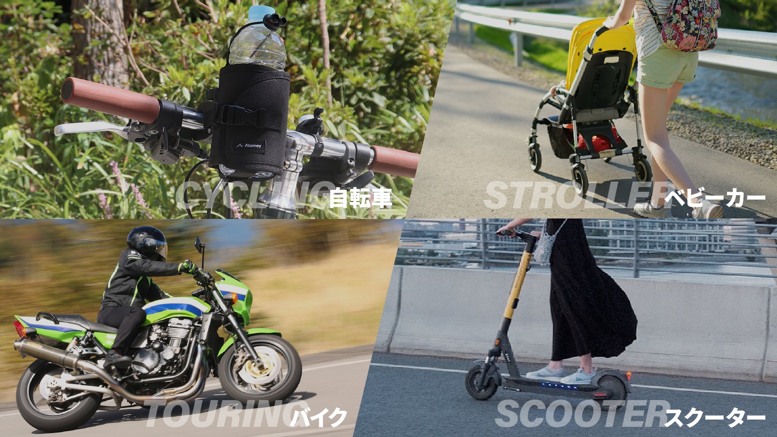 自転車だけでなく、バイクや電動スクーター、ベビーカーなどのハンドルにも取付可能!