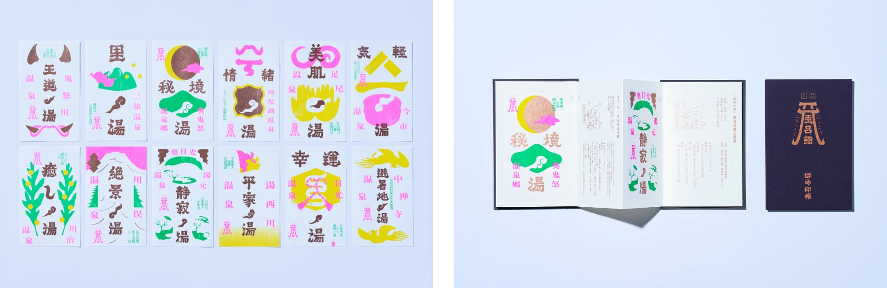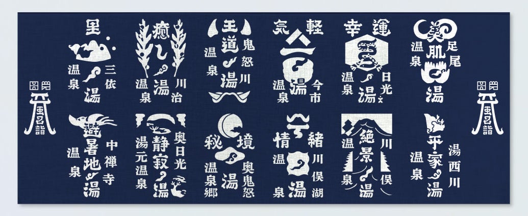 日光温泉地、12の御ゆ印札のデザインを手捺染で1枚ずつ丁寧に染めた、日光風呂詣限定の手ぬぐい。